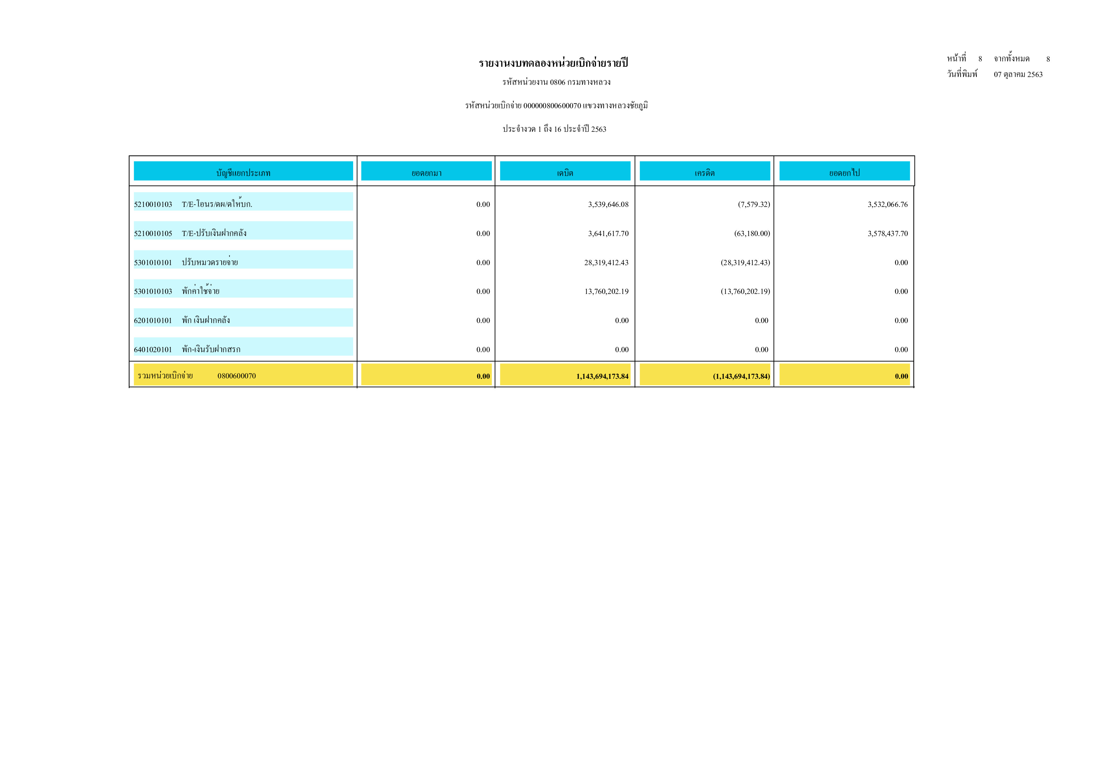 รายงานงบทดลองหน่วยเบิกจ่ายรายปี ประจำปี 2563 |