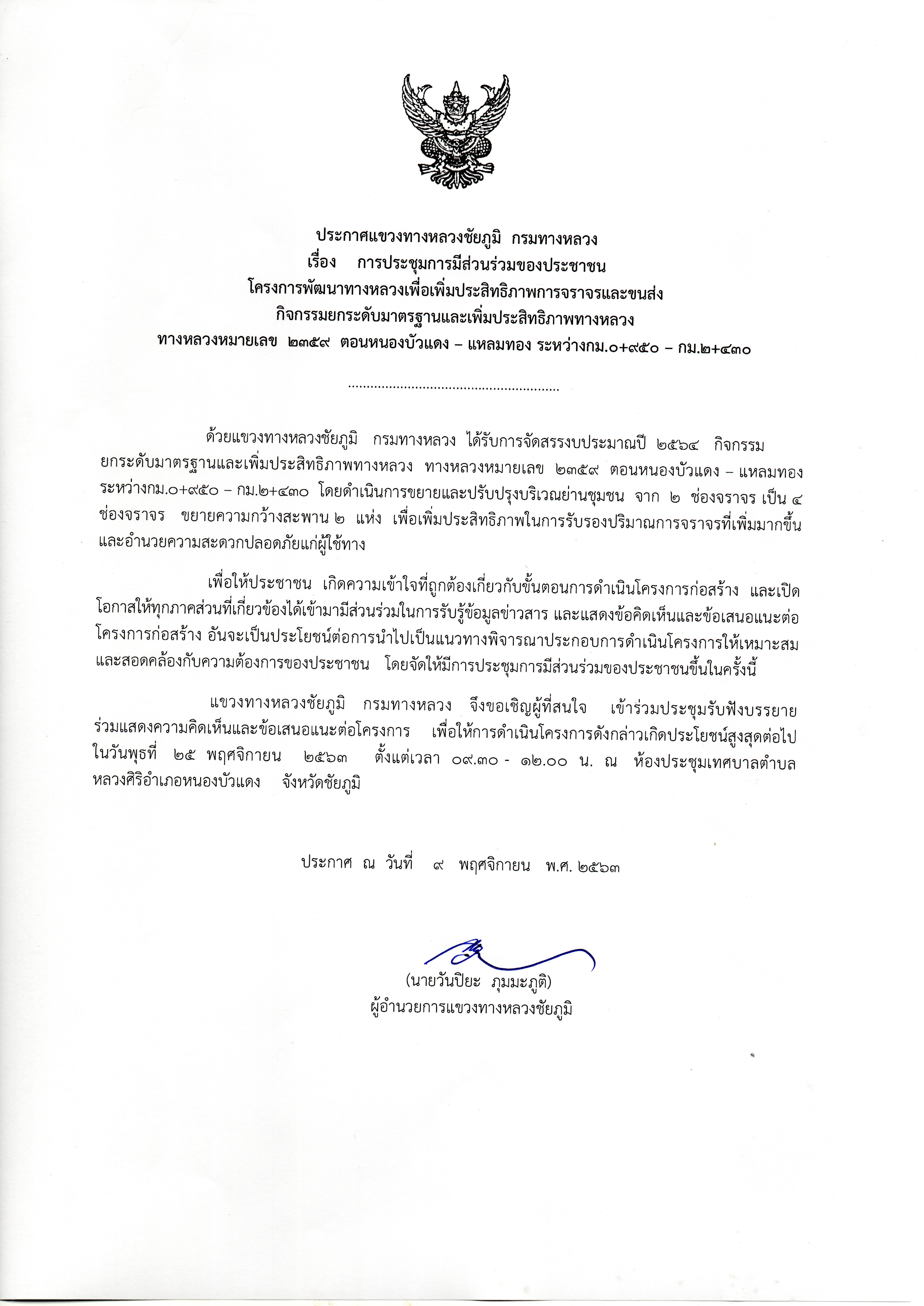 แขวงทางหลวงชัยภูมิจัดประชุมการมีส่วนร่วมของประชาชน โครงการพัฒนาทางหลวงเพื่อเพิ่มประสิทธิภาพการจราจรและขนส่ง