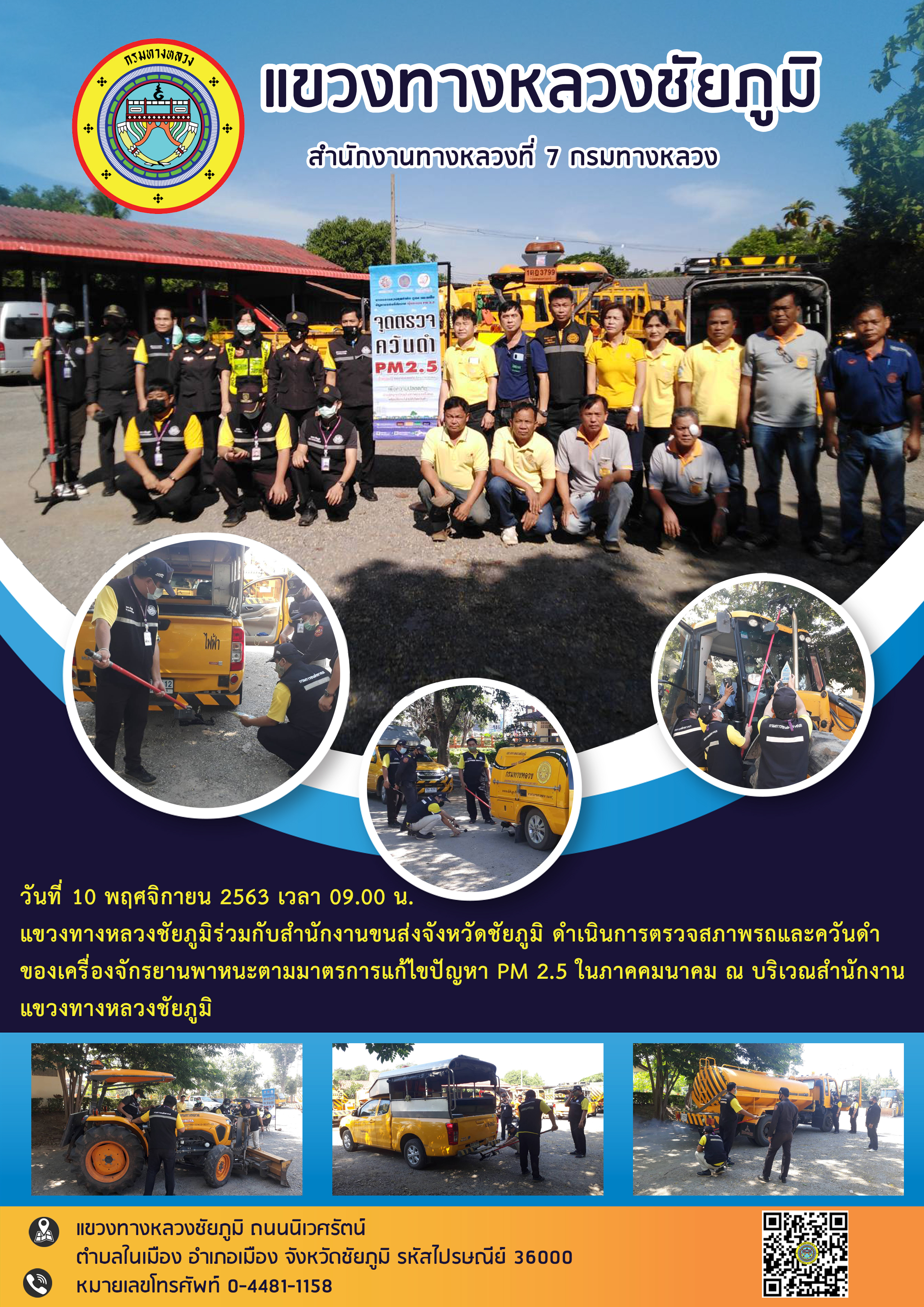วันที่ 10 พฤศจิกายน 2563 เวลา 09.00 น. แขวงทางหลวงชัยภูมิร่วมกับสำนักงานขนส่งจังหวัดชัยภูมิ ดำเนินการตรวจสภาพรถและควันดำของเครื่องจักรยานพาหนะตามมาตรการแก้ไขปัญหา PM 2.5 ในภาคคมนาคม ณ บริเวณสำนักงานแขวงทางหลวงชัยภูมิ