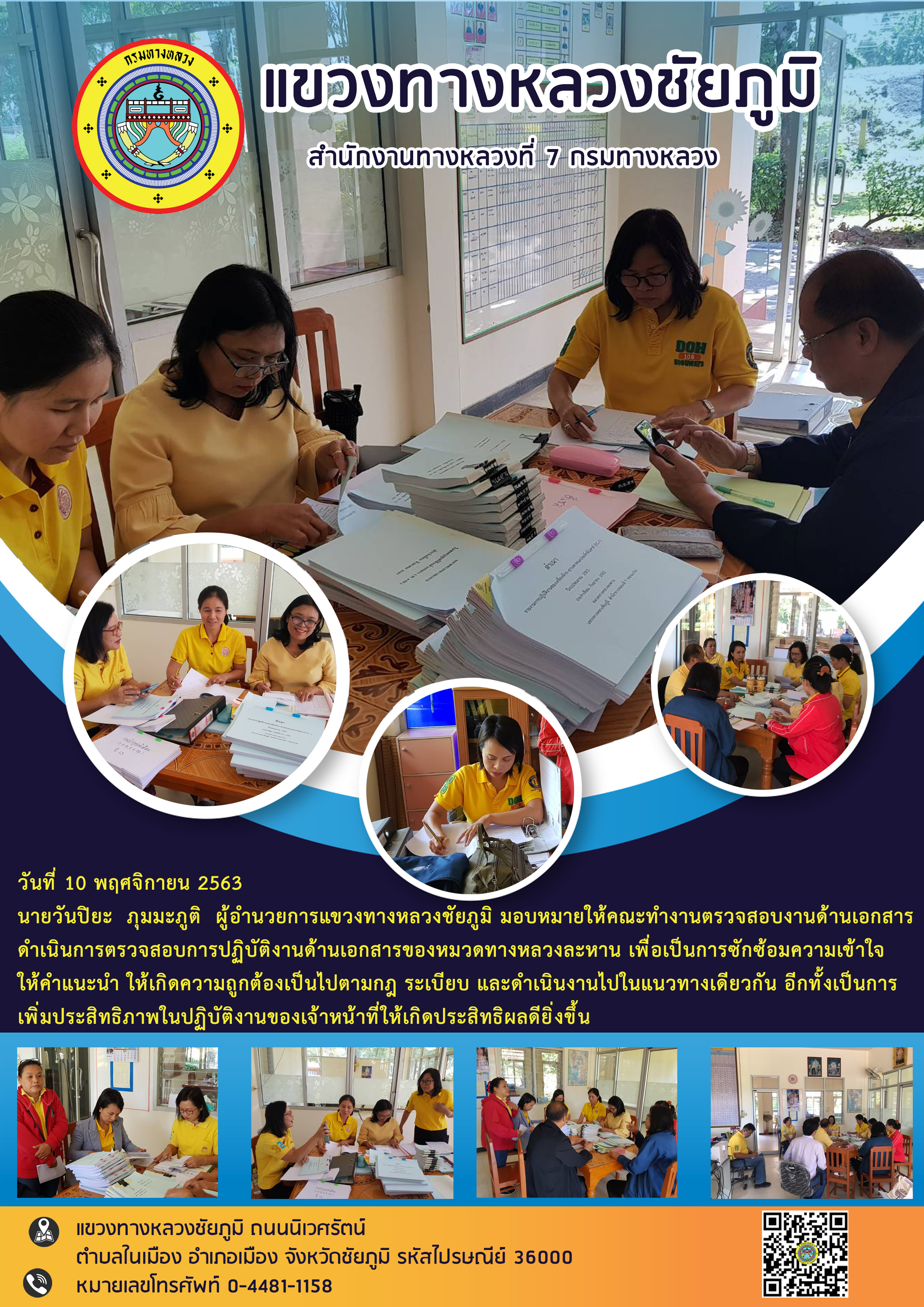วันที่ 10 พฤศจิกายน 2563 นายวันปิยะ ภุมมะภูติ ผู้อำนวยการแขวงทางหลวงชัยภูมิ มอบหมายให้คณะทำงานตรวจสอบงานด้านเอกสาร ดำเนินการตรวจสอบการปฏิบัติงานด้านเอกสารของหมวดทางหลวงละหาน เพื่อเป็นการซักซ้อมความเข้าใจ ให้คำแนะนำ ให้เกิดความถูกต้องเป็นไปตามกฎ ระเบียบ และดำเนินงานไปในแนวทางเดียวกัน อีกทั้งเป็นการเพิ่มประสิทธิภาพในปฏิบัติงานของเจ้าหน้าที่ให้เกิดประสิทธิผลดียิ่งขึ้น
