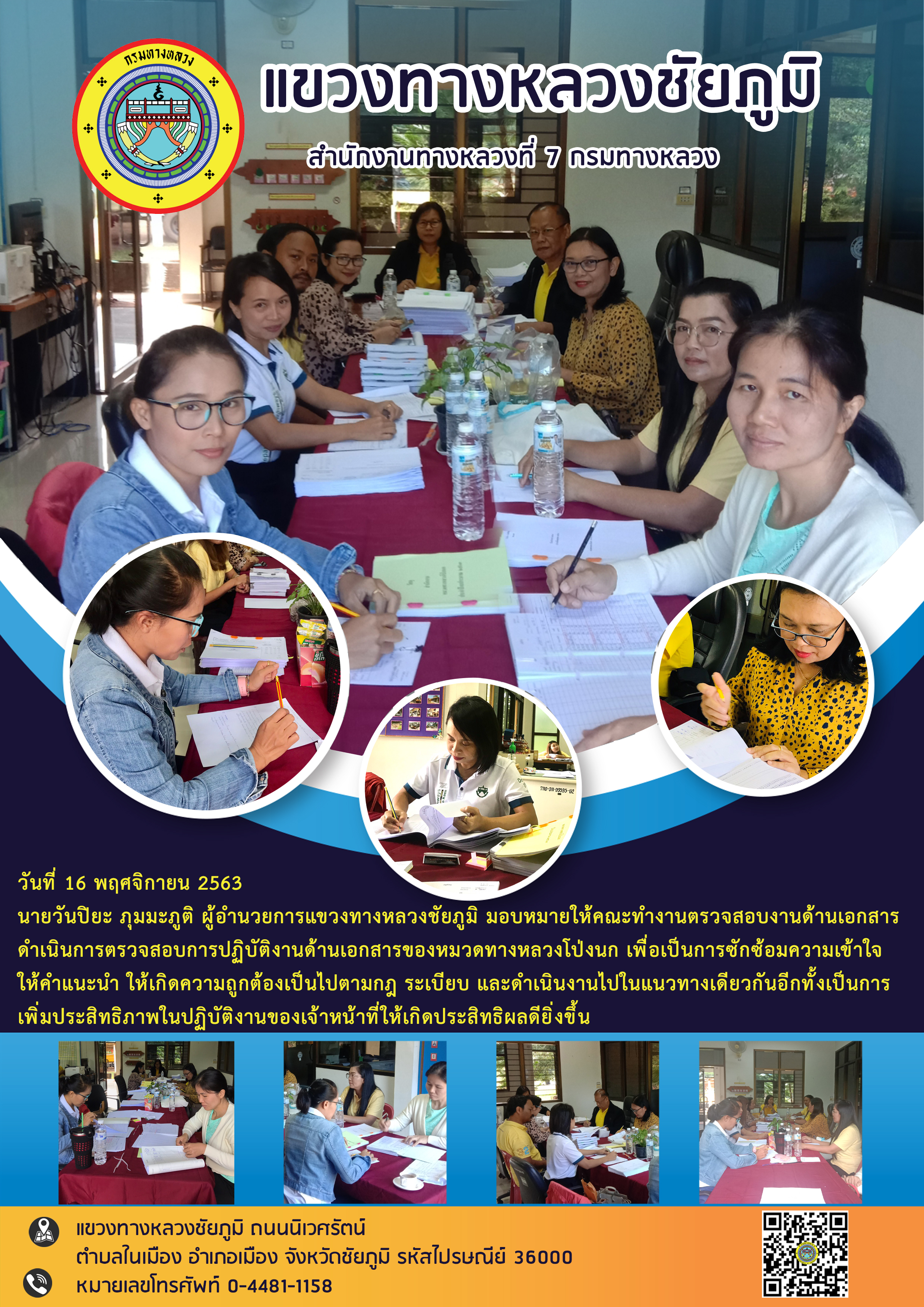 วันที่ 16 พฤศจิกายน 2563 นายวันปิยะ ภุมมะภูติ ผู้อำนวยการแขวงทางหลวงชัยภูมิ มอบหมายให้คณะทำงานตรวจสอบงานด้านเอกสาร ดำเนินการตรวจสอบการปฏิบัติงานด้านเอกสารของหมวดทางหลวงโป่งนก เพื่อเป็นการซักซ้อมความเข้าใจ ให้คำแนะนำ ให้เกิดความถูกต้องเป็นไปตามกฎ ระเบียบ และดำเนินงานไปในแนวทางเดียวกันอีกทั้งเป็นการเพิ่มประสิทธิภาพในปฏิบัติงานของเจ้าหน้าที่ให้เกิดประสิทธิผลดียิ่งขึ้น