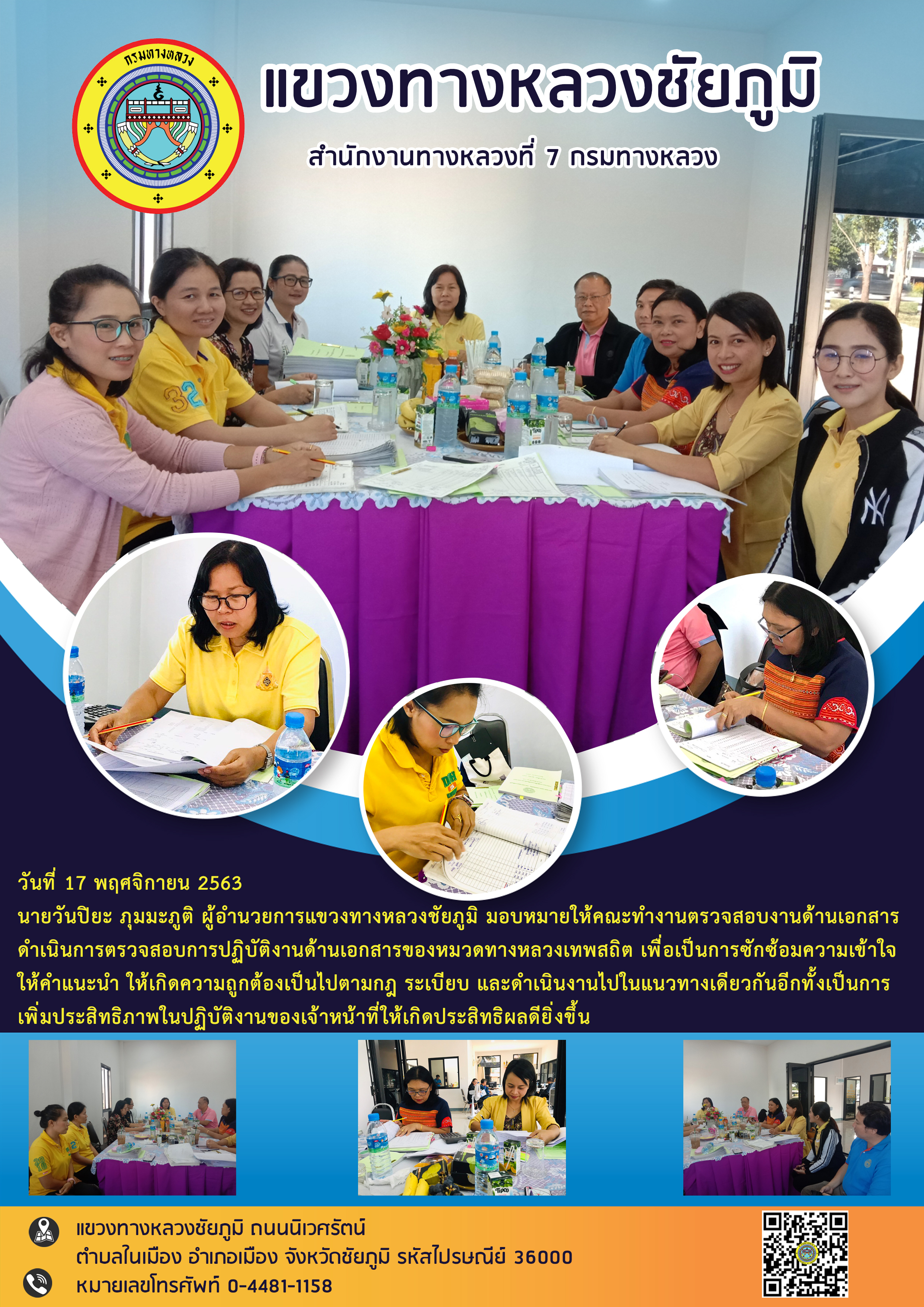 วันที่ 17 พฤศจิกายน 2563 นายวันปิยะ ภุมมะภูติ ผู้อำนวยการแขวงทางหลวงชัยภูมิ มอบหมายให้คณะทำงานตรวจสอบงานด้านเอกสาร ดำเนินการตรวจสอบการปฏิบัติงานด้านเอกสารของหมวดทางหลวงเทพสถิต เพื่อเป็นการซักซ้อมความเข้าใจ ให้คำแนะนำ ให้เกิดความถูกต้องเป็นไปตามกฎ ระเบียบ และดำเนินงานไปในแนวทางเดียวกันอีกทั้งเป็นการเพิ่มประสิทธิภาพในปฏิบัติงานของเจ้าหน้าที่ให้เกิดประสิทธิผลดียิ่งขึ้น
