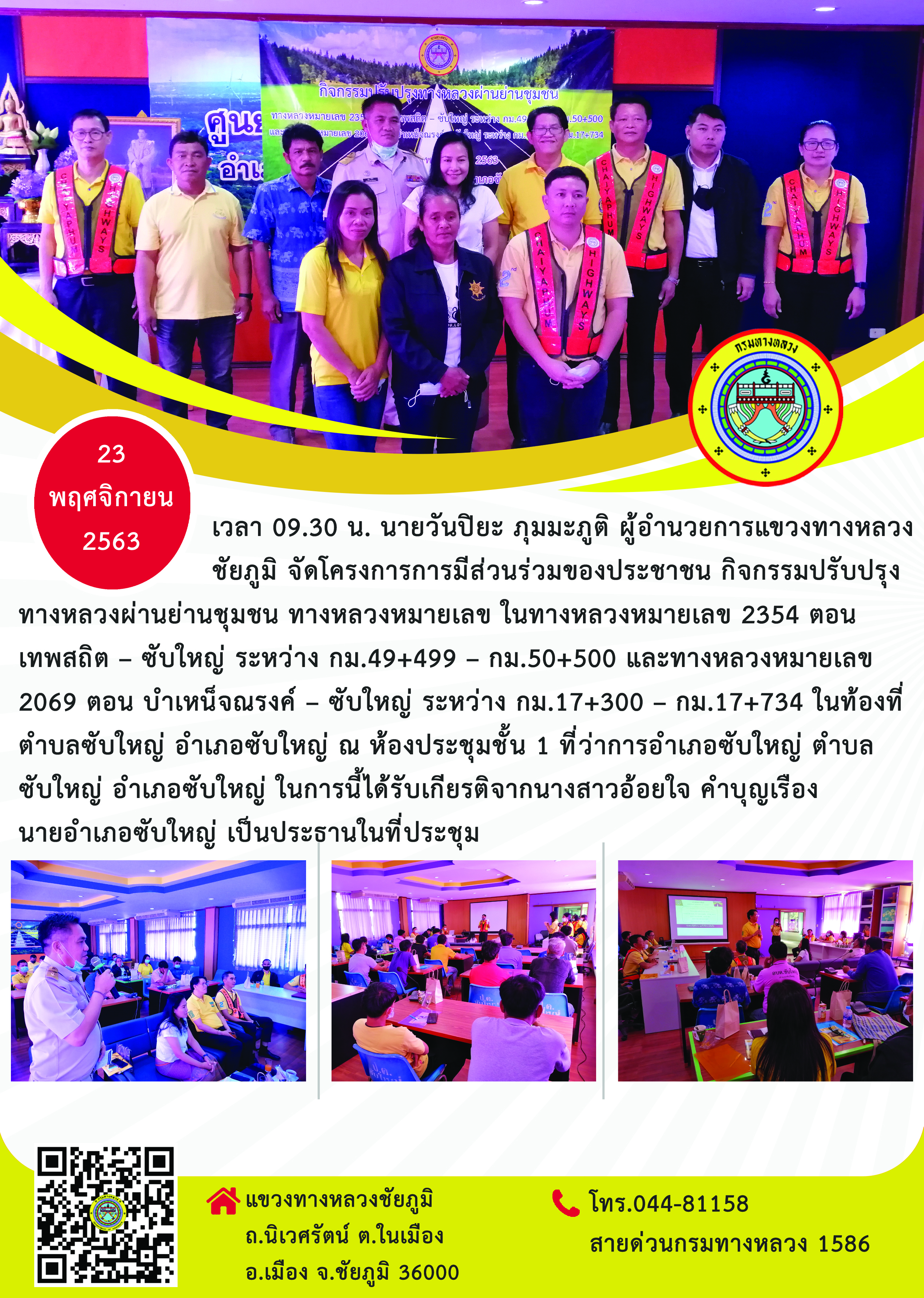 วันที่ 23 พฤศจิกายน 2563 เวลา 09.30 น. นายวันปิยะ ภุมมะภูติ ผู้อำนวยการแขวงทางหลวงชัยภูมิ จัดโครงการการมีส่วนร่วมของประชาชน กิจกรรมปรับปรุงทางหลวงผ่านย่านชุมชน ทางหลวงหมายเลข ในทางหลวงหมายเลข 2354 ตอน เทพสถิต – ซับใหญ่ ระหว่าง กม.49+499 – กม.50+500 และทางหลวงหมายเลข 2069 ตอน บำเหน็จณรงค์ – ซับใหญ่ ระหว่าง กม.17+300 – กม.17+734 ในท้องที่ตำบลซับใหญ่ อําเภอซับใหญ่ ณ ห้องประชุมชั้น 1 ที่ว่าการอำเภอซับใหญ่ ตำบลซับใหญ่ อำเภอซับใหญ่ ในการนี้ได้รับเกียรติจากนางสาวอ้อยใจ คำบุญเรือง นายอำเภอซับใหญ่ เป็นประธานในที่ประชุม