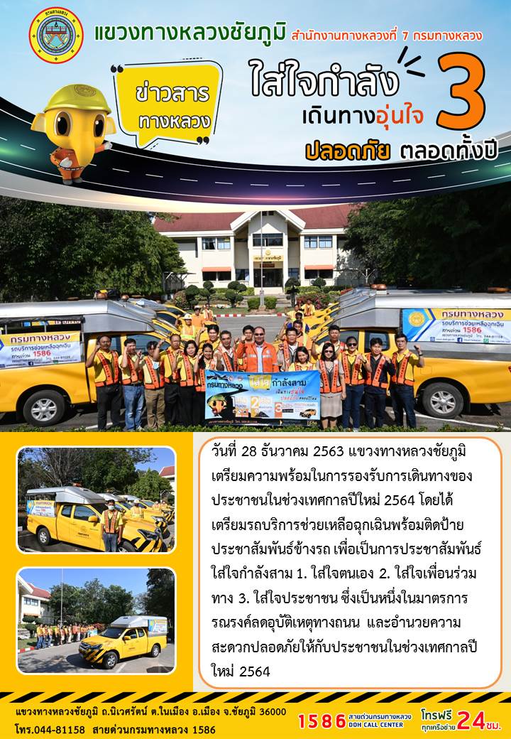 วันที่ 28 ธันวาคม 2563 แขวงทางหลวงชัยภูมิเตรียมความพร้อมในการรองรับการเดินทางของประชาชนในช่วงเทศกาลปีใหม่ 2564 โดยได้เตรียมรถบริการช่วยเหลือฉุกเฉินพร้อมติดป้ายประชาสัมพันธ์ข้างรถ เพื่อเป็นการประชาสัมพันธ์ ใส่ใจกำลังสาม 1. ใส่ใจตนเอง 2. ใส่ใจเพื่อนร่วมทาง 3. ใส่ใจประชาชน ซึ่งเป็นหนึ่งในมาตรการรณรงค์ลดอุบัติเหตุทางถนน และอำนวยความสะดวกปลอดภัยให้กับประชาชนในช่วงเทศกาลปีใหม่ 2564