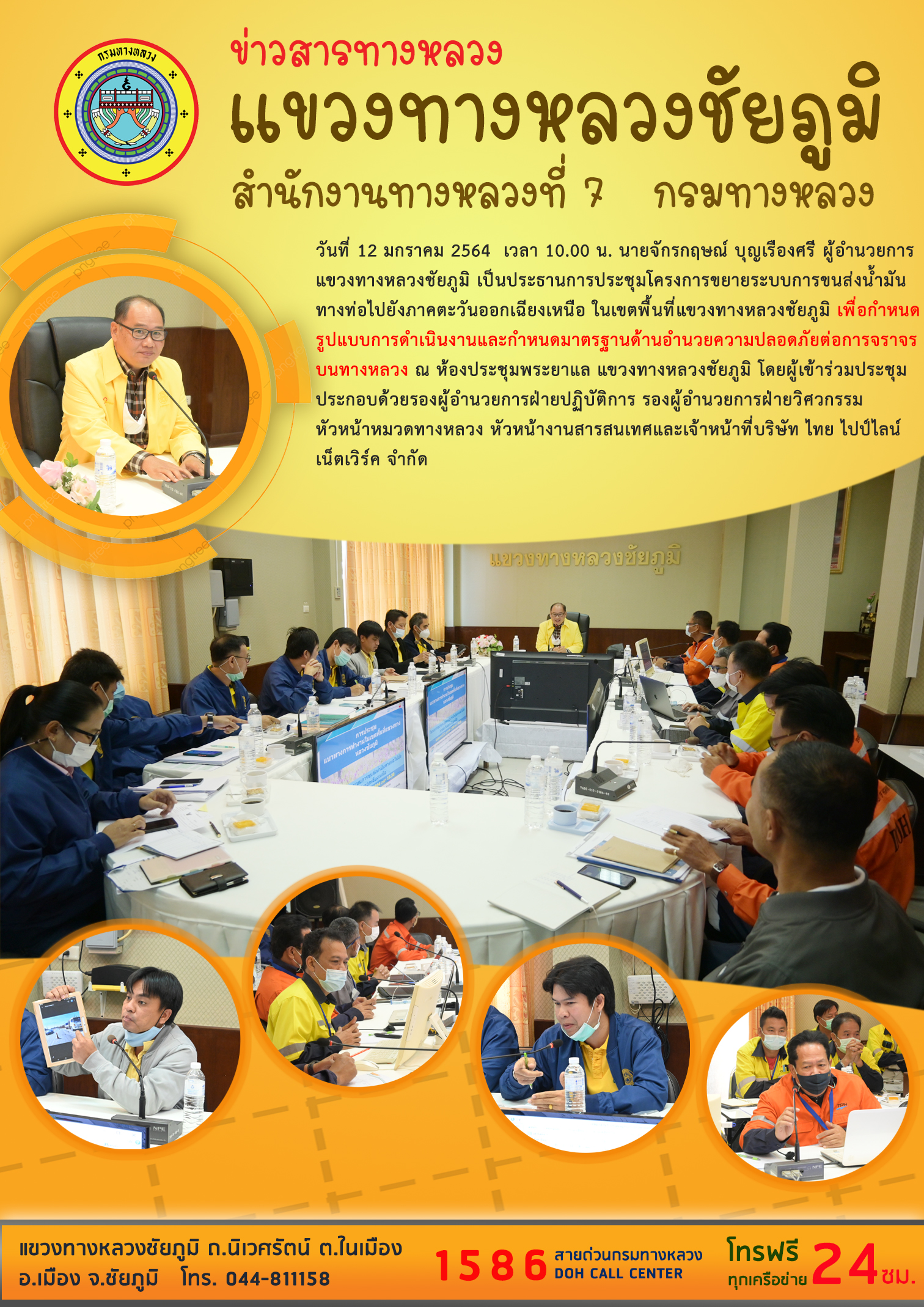 วันที่ 12 มกราคม 2564 เวลา 10.00 น. นายจักรกฤษณ์ บุญเรืองศรีิ ผู้อำนวยการแขวงทางหลวงชัยภูมิ เป็นประธานการประชุมโครงการขยายระบบการขนส่งน้ำมันทางท่อไปยังภาคตะวันออกเฉียงเหนือ ในเขตพื้นที่แขวงทางหลวงชัยภูมิ เพื่อกำหนดรูปแบบการดำเนินงานและกำหนดมาตรฐานด้านอำนวยความปลอดภัยต่อการจราจรบนทางหลวง ณ ห้องประชุมพระยาแล แขวงทางหลวงชัยภูมิ โดยผู้เข้าร่วมประชุมประกอบด้วยรองผู้อำนวยการฝ่ายปฏิบัติการ รองผู้อำนวยการฝ่ายวิศวกรรม หัวหน้าหมวดทางหลวง หัวหน้างานสารสนเทศและเจ้าหน้าที่บริษัท ไทย ไปป์ไลน์ เน็ตเวิร์ค จำกัด