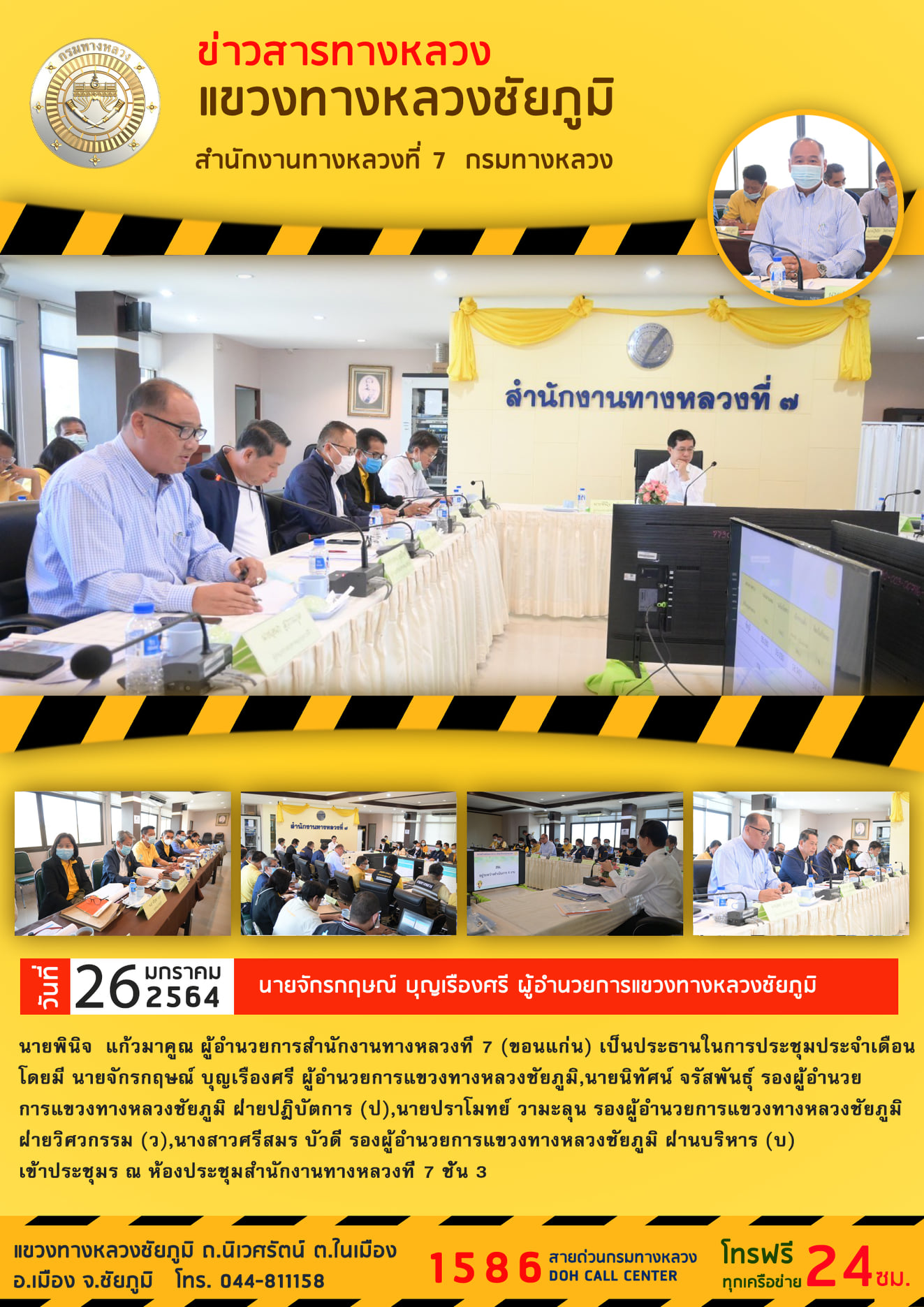 วันที่ 26 มกราคม 2564 เวลา 09.30 น. นายพินิจ แก้วมาคูณ ผู้อำนวยการสำนักงานทางหลวงที่ 7 (ขอนแก่น) เป็นประธานในการประชุมประจำเดือน มกราคม โดยมีนายจักรกฤษณ์ บุญเรืองศรี ผู้อำนวยการแขวงทางหลวงชัยภูมิ, นายนิทัศน์ จรัสพันธุ์ รองผู้อำนวยการแขวงทางหลวงชัยภูมิ (ฝ่ายปฏิบัติการ), นายปราโมทย์ วามะลุน รองผู้อำนวยการแขวงทางหลวงชัยภูมิ (ฝ่ายวิศวกรรม), นางสาวศรีสมร บัวดี รองผู้อำนวยการแขวงทางหลวงชัยภูมิ (ฝ่ายบริหาร) เข้าร่วมประชุม ณ ห้องประชุมสำนักงานทางหลวงที่ 7 ชั้น 3