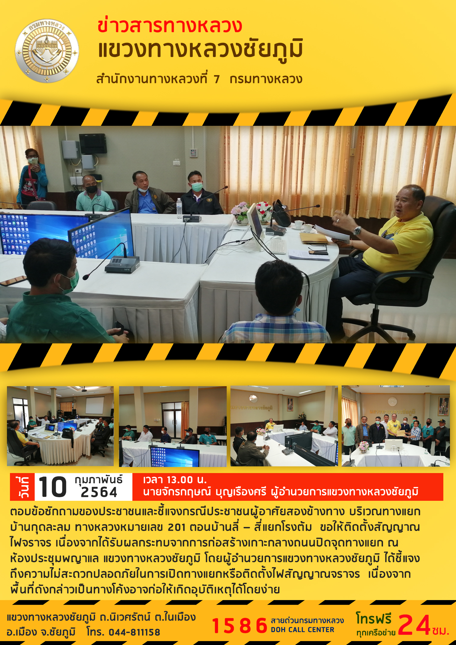 วันที่ 10 กุมภาพันธ์ 2564 เวลาประมาณ 13.00 น. นายจักรกฤษณ์ บุญเรืองศรี ผู้อำนวยการแขวงทางหลวงชัยภูมิ ตอบข้อซักถามของประชาชนและชี้แจงกรณีประชาชนผู้อาศัยสองข้างทาง บริเวณทางแยกบ้านกุดละลม ทางหลวงหมายเลข 201 ตอนบ้านลี่ – สี่แยกโรงต้ม ขอให้ติดตั้งสัญญาณไฟจราจร เนื่องจากได้รับผลกระทบจากการก่อสร้างเกาะกลางถนนปิดจุดทางแยก ณ ห้องประชุมพญาแล แขวงทางหลวงชัยภูมิ โดยผู้อำนวยการแขวงทางหลวงชัยภูมิ ได้ชี้แจงถึงความไม่สะดวกปลอดภัยในการเปิดทางแยกหรือติดตั้งไฟสัญญาณจราจร เนื่องจากพื้นที่ดังกล่าวเป็นทางโค้งอาจก่อให้เกิดอุบัติเหตุได้โดยง่าย