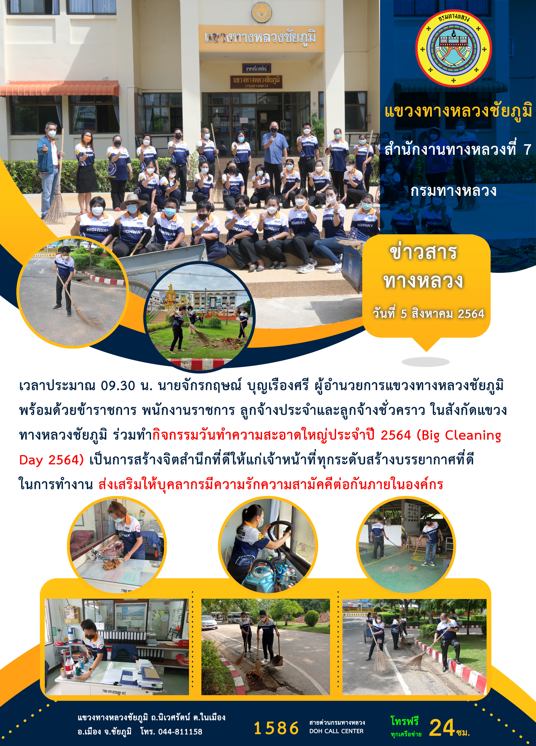 วันที่ 5 สิงหาคม 2564 เวลาประมาณ 09.30 น. นายจักรกฤษณ์ บุญเรืองศรี ผู้อำนวยการแขวงทางหลวงชัยภูมิ พร้อมด้วยข้าราชการ พนักงานราชการ ลูกจ้างประจำและลูกจ้างชั่วคราว ในสังกัดแขวงทางหลวงชัยภูมิ ร่วมทำกิจกรรมวันทำความสะอาดใหญ่ประจำปี 2564 (Big Cleaning Day 2564) เป็นการสร้างจิตสำนึกที่ดีให้แก่เจ้าหน้าที่ทุกระดับสร้างบรรยากาศที่ดีในการทำงาน ส่งเสริมให้บุคลากรมีความรักความสามัคคีต่อกันภายในองค์กร