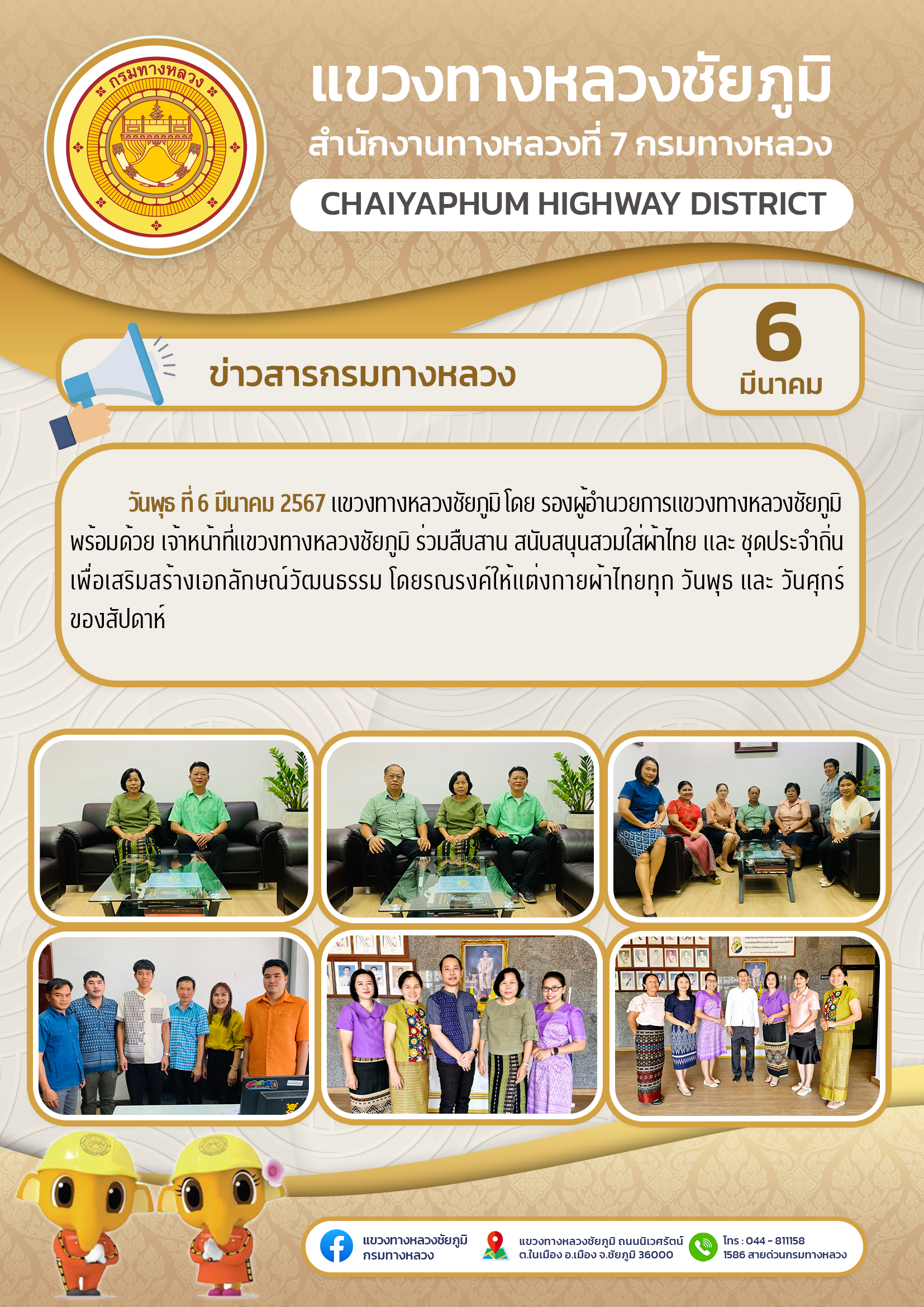 วันพุธ ที่ 6 มีนาคม 2567 แขวงทางหลวงชัยภูมิ โดย รองผู้อำนวยการแขวงทางหลวงชัยภูมิ พร้อมด้วย เจ้าหน้าที่แขวงทางหลวงชัยภูมิ ร่วมสืบสาน สนับสนุนสวมใส่ผ้าไทย และ ชุดประจำถิ่น เพื่อเสริมสร้างเอกลักษณ์วัฒนธรรม โดยรณรงค์ให้แต่งกายผ้าไทยทุก วันพุธ และ วันศุกร์ ของสัปดาห์