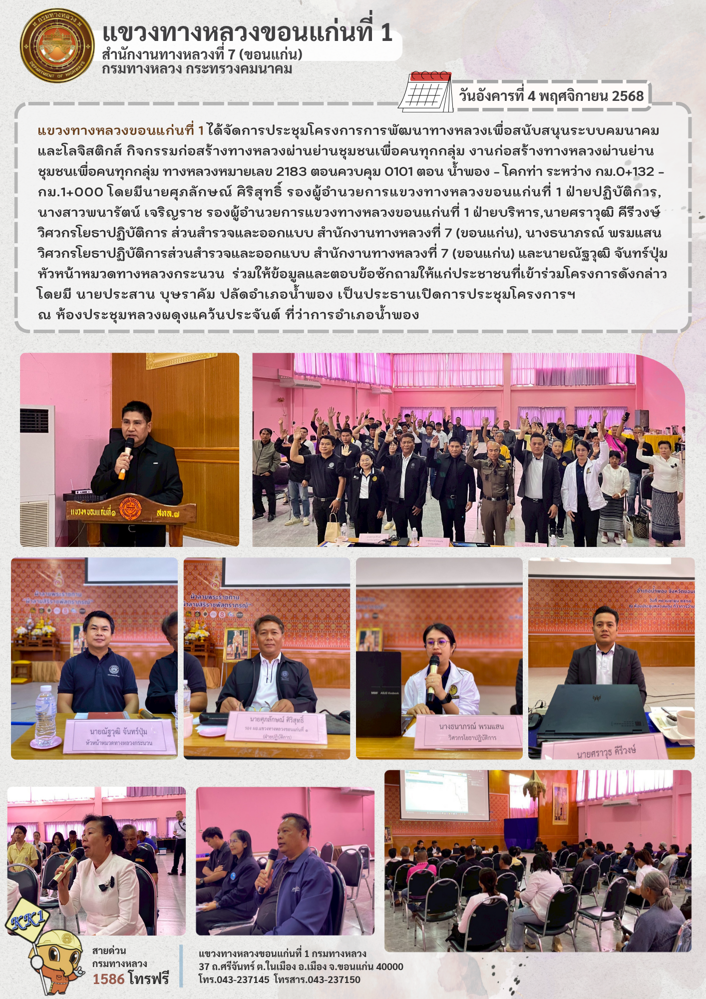 ประชุมโครงการการพัฒนาทางหลวงเพื่อสนับสนุนระบบคมนาคม และโลจิสติกส์ กิจกรรมก่อสร้างทางหลวงผ่านย่านชุมชนเพื่อคนทุกกลุ่ม งานก่อสร้างทางหลวงผ่านย่าน ชุมชนเพื่อคนทุกกลุ่ม ทางหลวงหมายเลข 2183 ตอนควบคุม 0101 ตอน น้ำพอง - โคกท่า ระหว่าง กม.0+132 - กม.1+000