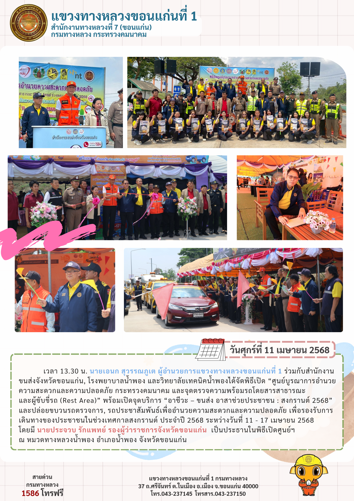 จัดพิธีเปิดศูนย์อำนวยความสะดวก และความปลอดภัยช่วงเทศกาลสงกรานต์ 2568, ศูนย์บูรณาการตรวจความพร้อมรถโดยสารสาธารณะ และโครงการ "เดินทางอุ่นใจปลอดภัยไปกับกรมทางหลวง" และปล่อยขบวนรถตรวจการ, รถประชาสัมพันธ์เพื่ออำนวยความสะดวกและความปลอดภัยช่วงเทศกาลสงกรานต์ 2568