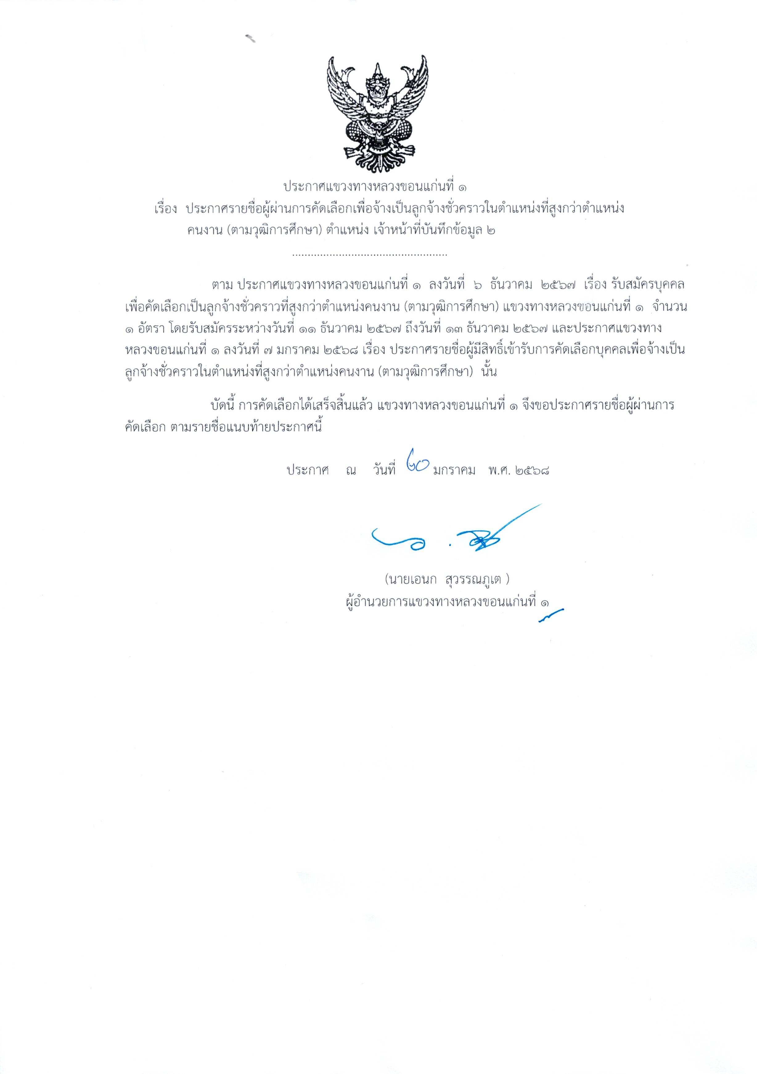 เรื่อง ประกาศรายชื่อผู้ผ่านการคัดเลือกเพื่อจ้างเป็นลูกจ้างชั่วคราวที่สูงกว่าตำแหน่งคนงาน (ตามวุฒิการศึกษา) ฝ่ายบริหารงานทั่วไป ตามประกาศแขวงทางหลวงขอนแก่นที่ 1 กรมทางหลวง ลงวันที่ 7 มกราคม 2568