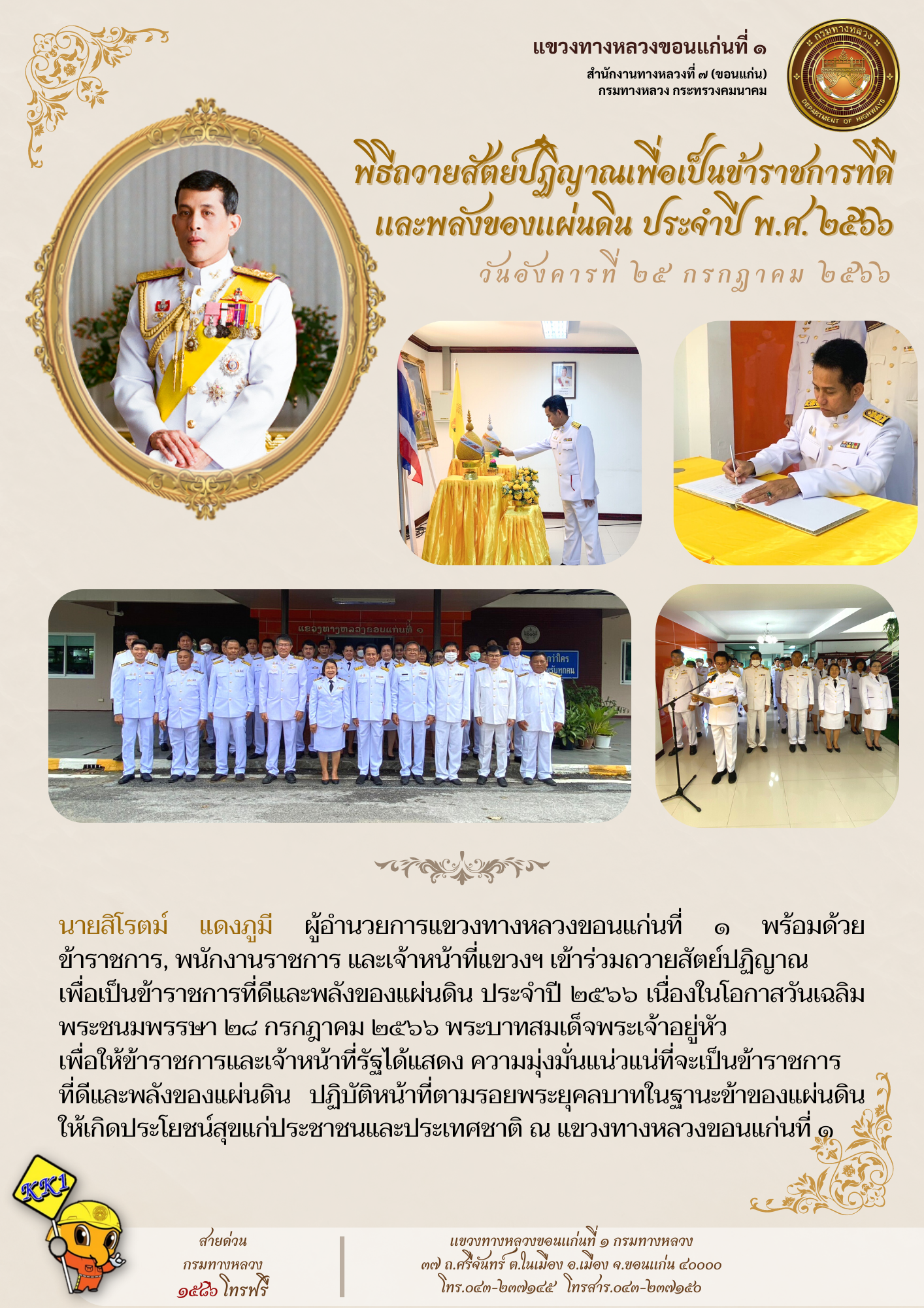 วันอังคารที่ 25 กรกฎาคม 2566 เวลา 09.30 น. นายสิโรตม์ แดงภูมี ผู้อำนวยการแขวงทางหลวงขอนแก่นที่ 1 พร้อมด้วยข้าราชการ, พนักงานราชการ และเจ้าหน้าที่แขวงฯ เข้าร่วมถวายสัตย์ปฏิญาณ เพื่อเป็นข้าราชการที่ดีและพลังของแผ่นดิน ประจำปี 2566 เนื่องในโอกาสวันเฉลิมพระชนมพรรษา 28 กรกฎาคม 2566 พระบาทสมเด็จพระเจ้าอยู่หัวเพื่อให้ข้าราชการและเจ้าหน้าที่รัฐได้แสดง ความมุ่งมั่นแน่วแน่ที่จะเป็นข้าราชการที่ดี และพลังของแผ่นดิน ปฏิบัติหน้าที่ตามรอยพระยุคลบาทในฐานะข้าของแผ่นดินให้เกิดประโยชน์สุขแก่ประชาชนและประเทศชาติ ณ แขวงทางหลวงขอนแก่นที่ 1