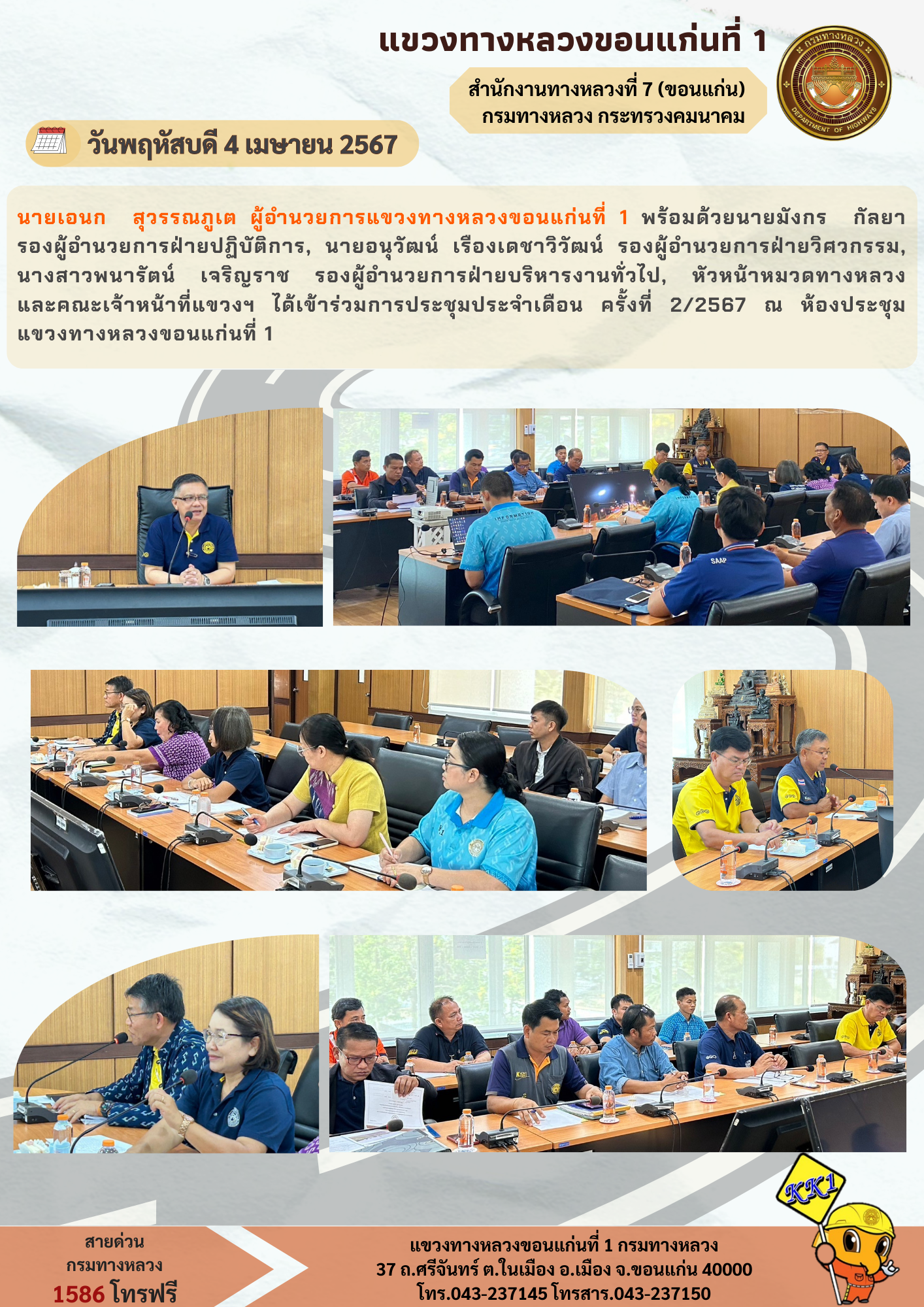 นายเอนก สุวรรณภูเต ผู้อำนวยการแขวงทางหลวงขอนแก่นที่ 1 พร้อมด้วยนายมังกร กัลยา รองผู้อำนวยการฝ่ายปฏิบัติการ, นายอนุวัฒน์ เรืองเดชาวิวัฒน์ รองผู้อำนวยการฝ่ายวิศวกรรม, นางสาวพนารัตน์ เจริญราช รองผู้อำนวยการฝ่ายบริหารงานทั่วไป, หัวหน้าหมวดทางหลวง และคณะเจ้าหน้าที่แขวงฯ ได้เข้าร่วมการประชุมประจำเดือน ครั้งที่ 2/2567 ณ ห้องประชุมแขวงทางหลวงขอนแก่นที่ 1