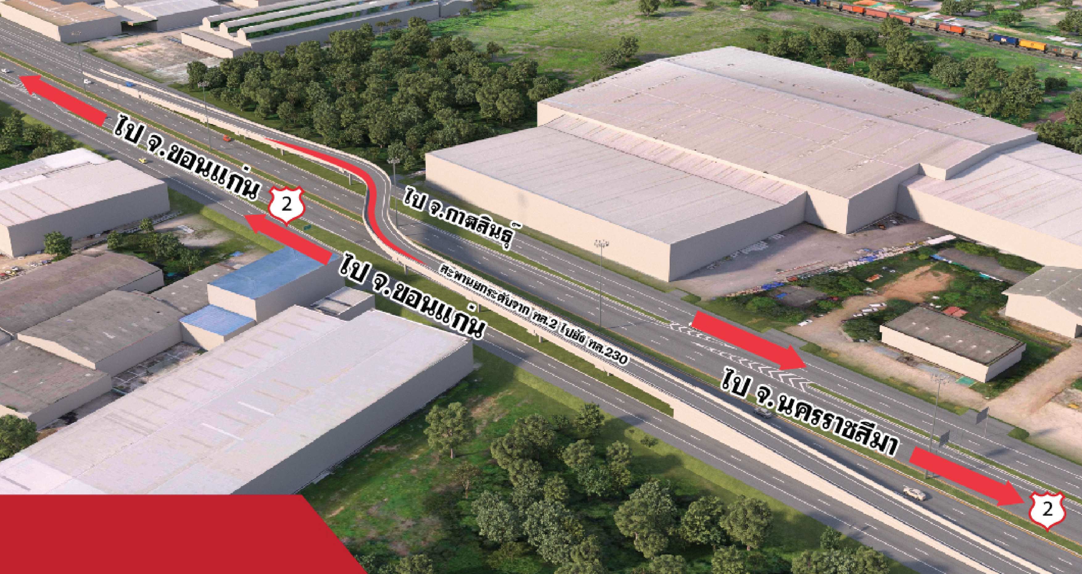 - ก่อสร้างทางแยกต่างระดับรูปแบบ One Directional Ramp With Overpass And Bridge Missing Link And Roundabout โดยแบ่งเป็นสะพานแนวใหม่ (Directional Ramp) บนทล.2 ทิศทางจากจังหวัดขอนแก่นไปสู่จังหวัดเลย ที่ กม.332+100 มีขนาดความกว้างขนาด 6 เมตร ยาว 362 เมตร และสะพานบริเวณทางเข้าสถานีขนส่งผู้โดยสารจังหวัดขอนแก่นแห่งที่ 3 ตามแนว ทล.230 ที่ กม.0+891.079 มีขนาดความกว้าง 14 เมตร ยาว 48 เมตร และก่อสร้างสะพานต่อขยายข้ามทล.2 ทิศทางจากจังหวัดเลยไปสู่จังหวัดนครราชสีมา บริเวณ กม.1+626 มีขนาดความกว้าง 14.50 เมตร ยาว 218 เมตร รวมทั้งสะพานต่อขยายข้ามทางรถไฟเพื่อเชื่อมการจราจรในทิศทางจากจังหวัดขอนแก่นไปจังหวัดกาฬสินธุ์ บริเวณ กม.0+318 มีขนาดความกว้าง 14.50 เมตร และความยาว 134 เมตร