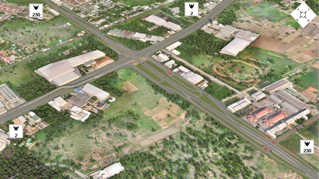 - การดำเนินการก่อสร้างบนทางหลวงหมายเลข 230 จุดเริ่มต้นก่อสร้างบริเวณ กม.0+000 หรือบริเวณ กม.1+750 ของทางหลวงหมายเลข 230 และจุดสิ้นสุดการปรับปรุงบริเวณ กม.2+848 หรือ กม.47+400 ของทางหลวงหมายเลข 230 รวมระยะทางการปรับปรุงถนนโครงการประมาณ 2,848 เมตร โดยปรับปรุงขยายช่องจราจรที่อยู่ในแนวเส้นทางเดิมให้มีช่องทางหลักและช่องทางขนาน กล่าวคือ ออกแบบให้มีช่องหลัก ขนาด 6 ช่องจราจร (3 ช่องจราจรต่อทิศทาง) ความกว้างช่องจราจรละ 3.50 เมตร แบ่งทิศทางการจราจรด้วยเกาะแบบยก (Raised Median) กว้าง 5.10 เมตร ไหล่ทางด้านนอกกว้าง 2.50 เมตร สำหรับทางคู่ขนานฝั่งละ 2 ช่องจราจร ความกว้างช่องจราจรละ 3.50 เมตร ไหล่ทางด้านในกว้าง 1.50 เมตร ไหล่ทางด้านนอกกว้าง 2.50 เมตร มีทางเท้าพร้อมกับระบบสาธารณูปโภคขนาด 3.60 เมตร รวมทั้ง เกาะกลางระหว่างทางหลักและทางคู่ขนานแบบร่องน้ำกว้าง 8.50 เมตร