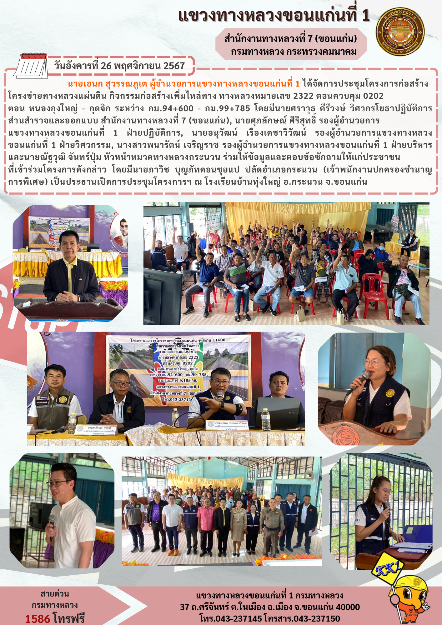 นายเอนก สุวรรณภูเต ผู้อำนวยการแขวงทางหลวงขอนแก่นที่ 1 ได้จัดการประชุมโครงการก่อสร้างโครงข่ายทางหลวงแผ่นดิน กิจกรรมก่อสร้างเพิ่มไหล่ทาง ทางหลวงหมายเลข 2322 ตอนควบคุม 0202 ตอน หนองกุงใหญ่ - กุดจิก ระหว่าง กม.94+600 - กม.99+785 โดยมีนายศราวุธ คีรีวงษ์ วิศวกรโยธาปฏิบัติการ ส่วนสำรวจและออกแบบ สำนักงานทางหลวงที่ 7 (ขอนแก่น), นายศุภลักษณ์ ศิริสุทธิ์ รองผู้อำนวยการแขวงทางหลวงขอนแก่นที่ 1 ฝ่ายปฏิบัติการ, นายอนุวัฒน์ เรืองเดชาวิวัฒน์ รองผู้อำนวยการแขวงทางหลวงขอนแก่นที่ 1 ฝ่ายวิศวกรรม, นางสาวพนารัตน์ เจริญราช รองผู้อำนวยการแขวงทางหลวงขอนแก่นที่ 1 ฝ่ายบริหาร และนายณัฐวุฒิ จันทร์ปุ่ม หัวหน้าหมวดทางหลวงกระนวน ร่วมให้ข้อมูลและตอบข้อซักถามให้แก่ประชาชนที่เข้าร่วมโครงการดังกล่าว โดยมีนายภาวิช บุญภัทดอนชุยแป ปลัดอำเภอกระนวน (เจ้าพนักงานปกครองชำนาญการพิเศษ) เป็นประธานเปิดการประชุมโครงการฯ ณ โรงเรียนบ้านทุ่งใหญ่ อ.กระนวน จ.ขอนแก่น