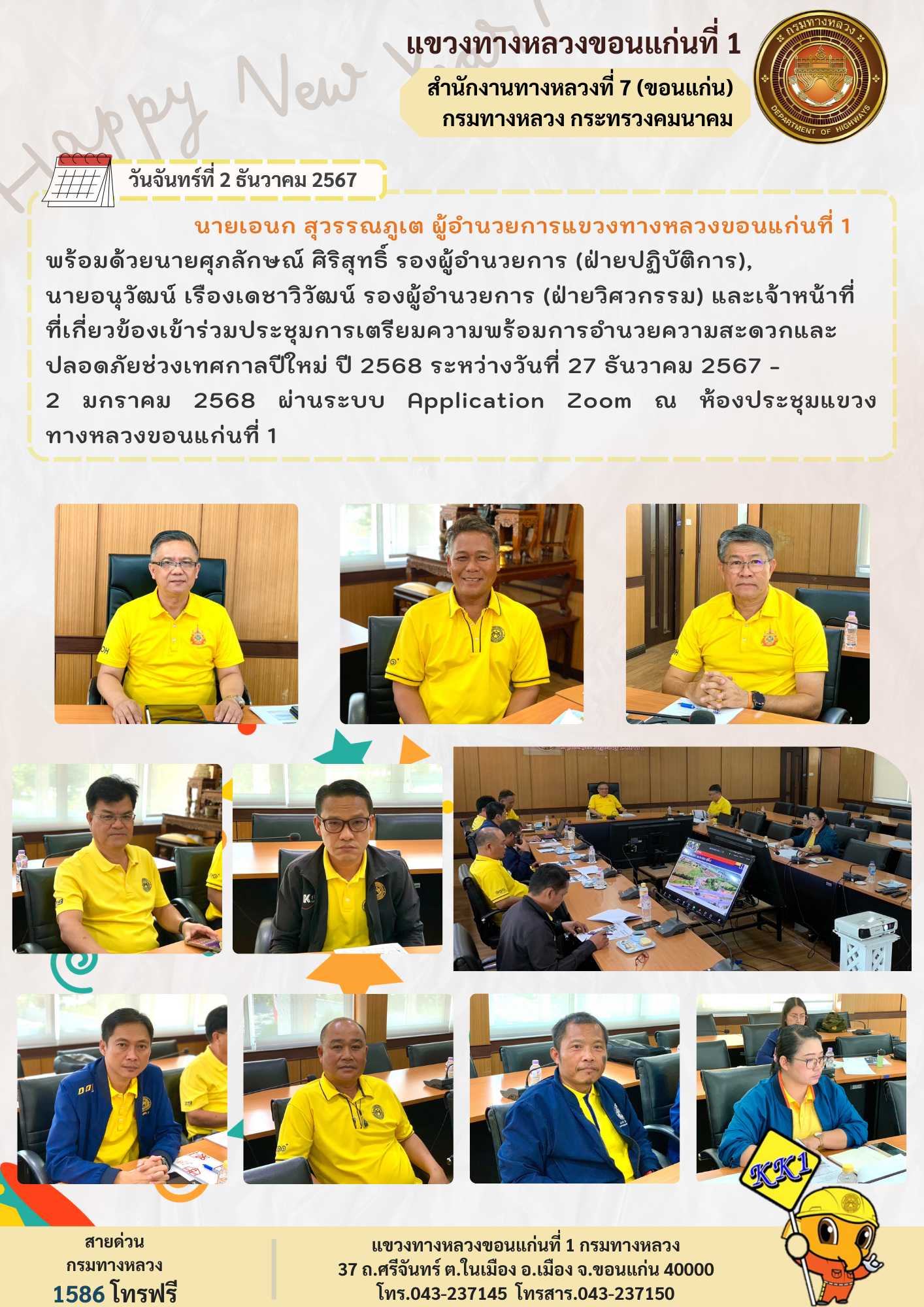 นายเอนก สุวรรณภูเต ผู้อำนวยการแขวงทางหลวงขอนแก่นที่ 1 พร้อมด้วยนายศุภลักษณ์ ศิริสุทธิ์ รองผู้อำนวยการ (ฝ่ายปฏิบัติการ), นายอนุวัฒน์ เรืองเดชาวิวัฒน์ รองผู้อำนวยการ (ฝ่ายวิศวกรรม) และเจ้าหน้าที่ที่เกี่ยวข้องเข้าร่วมประชุมการเตรียมความพร้อมการอำนวยความสะดวกและปลอดภัยช่วงเทศกาลปีใหม่ ปี 2568 ระหว่างวันที่ 27 ธันวาคม 2567 - 2 มกราคม 2568 ผ่านระบบ Application Zoom ณ ห้องประชุมแขวงทางหลวงขอนแก่นที่ 1