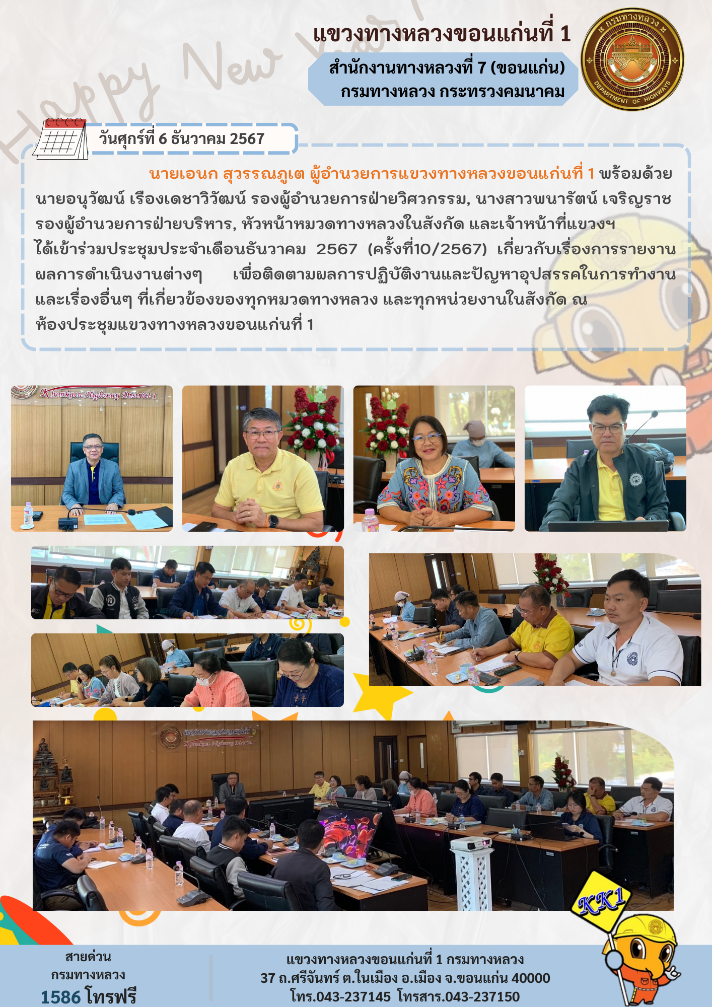 นายเอนก สุวรรณภูเต ผู้อำนวยการแขวงทางหลวงขอนแก่นที่ 1 พร้อมด้วยนายอนุวัฒน์ เรืองเดชาวิวัฒน์ รองผู้อำนวยการฝ่ายวิศวกรรม, นางสาวพนารัตน์ เจริญราช รองผู้อำนวยการฝ่ายบริหาร, หัวหน้าหมวดทางหลวงในสังกัด และเจ้าหน้าที่แขวงฯ ได้เข้าร่วมประชุมประจำเดือนธันวาคม 2567 (ครั้งที่10/2567) เกี่ยวกับเรื่องการรายงาน ผลการดำเนินงานต่างๆ เพื่อติดตามผลการปฏิบัติงานและปัญหาอุปสรรคในการทำงาน และเรื่องอื่นๆ ที่เกี่ยวข้องของทุกหมวดทางหลวง และทุกหน่วยงานในสังกัด ณ ห้องประชุมแขวงทางหลวงขอนแก่นที่ 1
