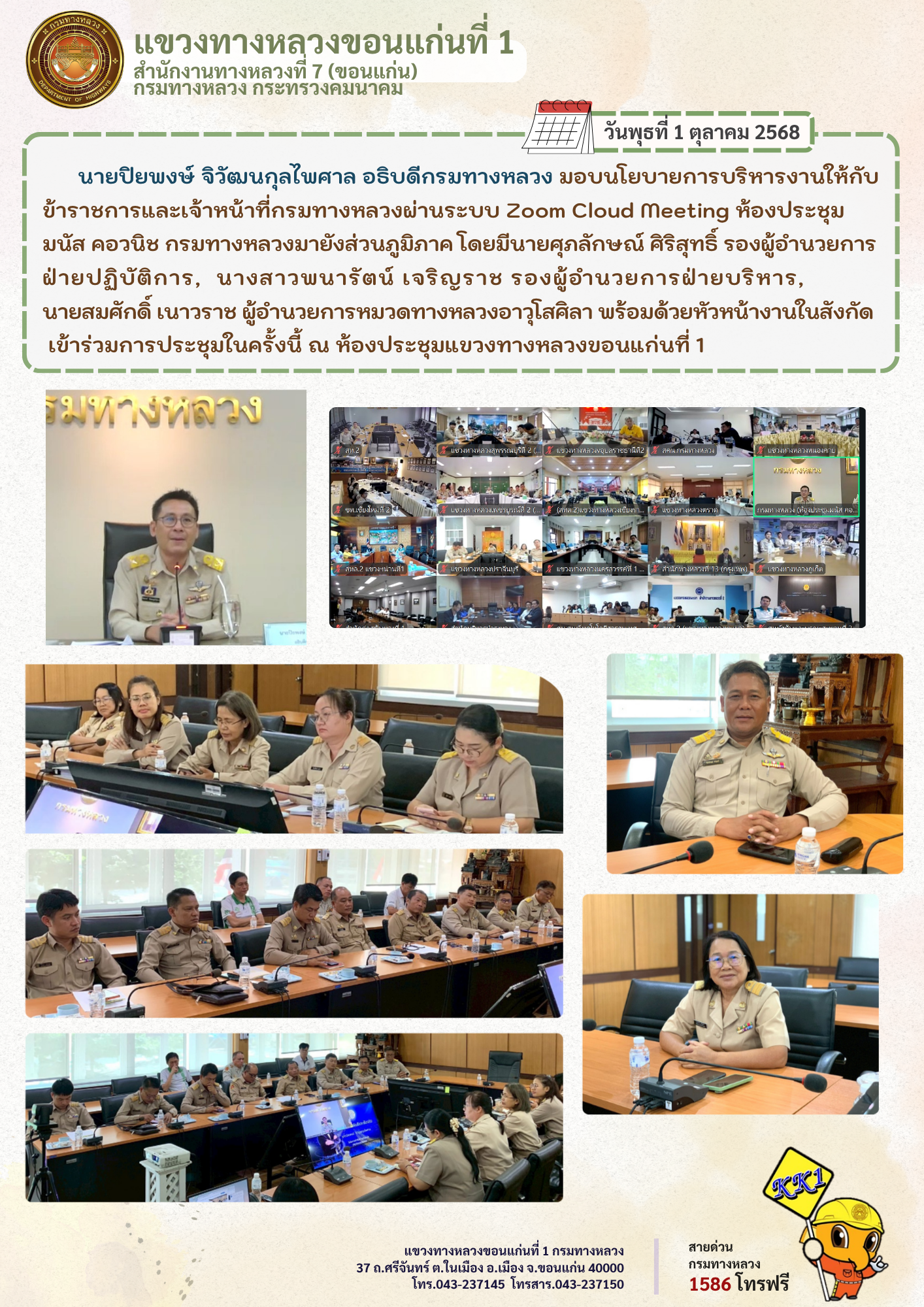 นายปิยพงษ์ จิวัฒนกุลไพศาล อธิบดีกรมทางหลวง มอบนโยบายการบริหารงานให้กับข้าราชการและเจ้าหน้าที่กรมทางหลวงผ่านระบบ Zoom Cloud Meeting ห้องประชุมมนัส คอวนิช กรมทางหลวงมายังส่วนภูมิภาค โดยมีนายศุภลักษณ์ ศิริสุทธิ์ รองผู้อำนวยการฝ่ายปฏิบัติการ, นางสาวพนารัตน์ เจริญราช รองผู้อำนวยการฝ่ายบริหาร, นายสมศักดิ์ เนาวราช ผู้อำนวยการหมวดทางหลวงอาวุโสศิลา พร้อมด้วยหัวหน้างานในสังกัดเข้าร่วมการประชุมในครั้งนี้ ณ ห้องประชุมแขวงทางหลวงขอนแก่นที่ 1