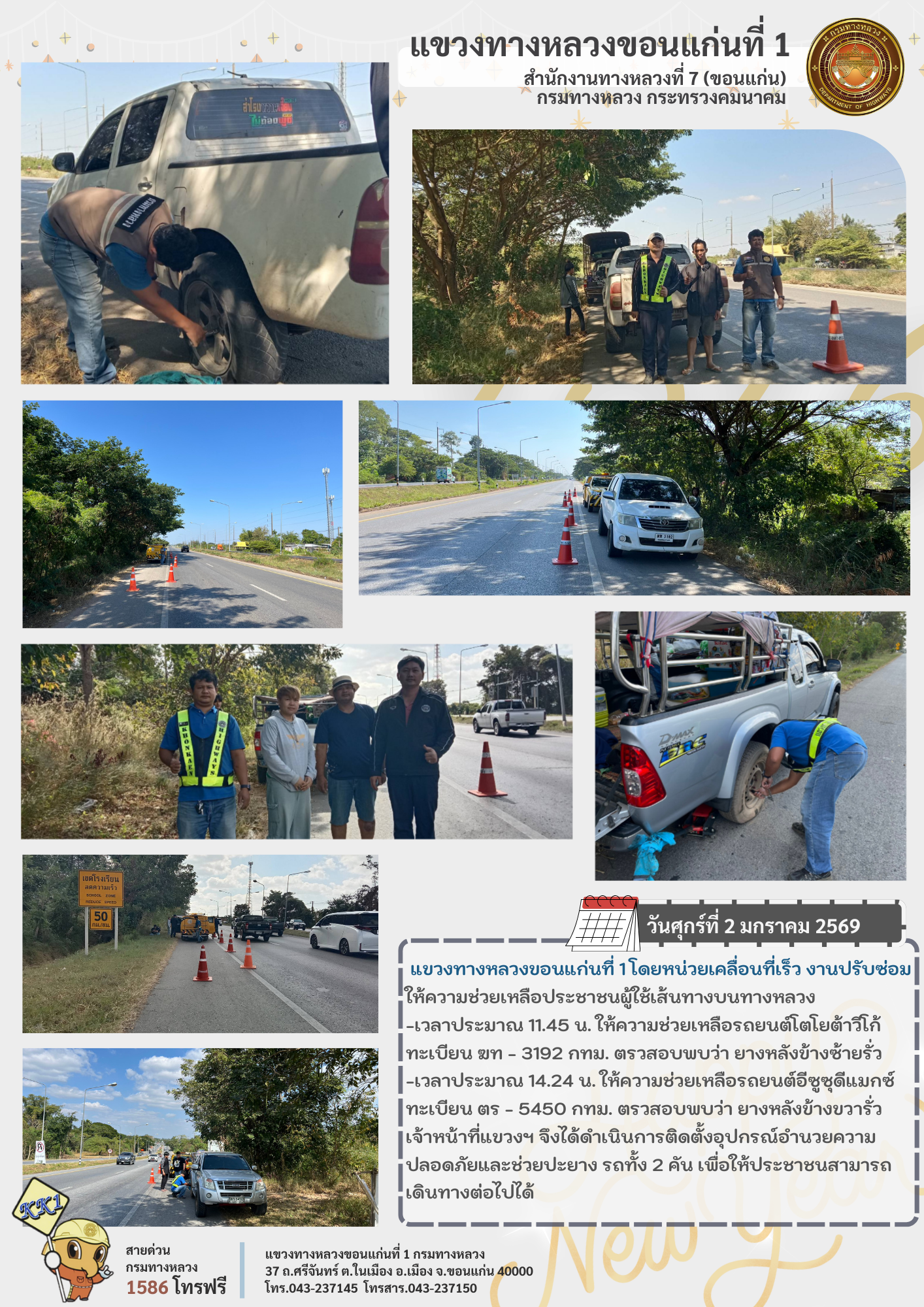 แขวงทางหลวงขอนแก่นที่ 1 โดยหน่วยเคลื่อนที่เร็ว งานปรับซ่อม ให้ความช่วยเหลือประชาชนผู้ใช้เส้นทางบนทางหลวง เวลาประมาณ 11.45 น. ให้ความช่วยเหลือรถยนต์โตโยต้าวีโก้ ทะเบียน ฆท - 3192 กทม. ตรวสอบพบว่า ยางหลังข้างซ้ายรั่ว เวลาประมาณ 14.24 น. ให้ความช่วยเหลือรถยนต์อีซูซุดีแมกซ์ ทะเบียน ตร - 5450 กทม. ตรวสอบพบว่า ยางหลังข้างขวารั่ว เจ้าหน้าที่แขวงฯ จึงได้ดำเนินการติดตั้งอุปกรณ์อำนวยความปลอดภัยและช่วยปะยาง รถทั้ง 2 คัน เพื่อให้ประชาชนสามารถเดินทางต่อไปได้