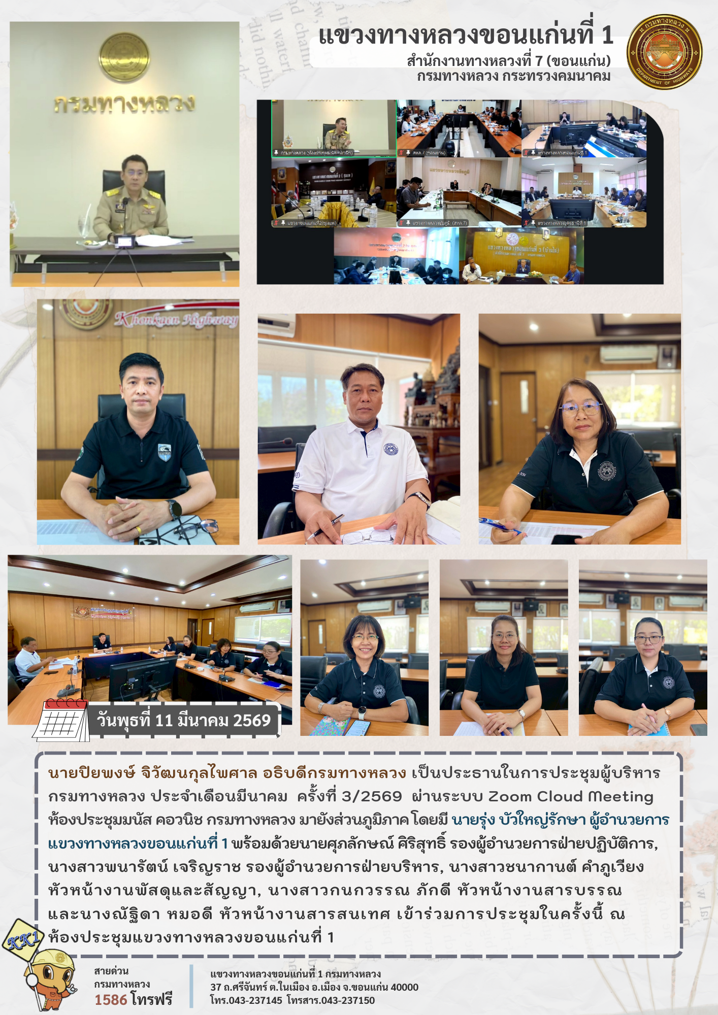 นายปิยพงษ์ จิวัฒนกุลไพศาล อธิบดีกรมทางหลวง เป็นประธานในการประชุมผู้บริหารกรมทางหลวง ประจำเดือนมีนาคม ครั้งที่ 3/2569 ผ่านระบบ Zoom Cloud Meeting ห้องประชุมมนัส คอวนิช กรมทางหลวง มายังส่วนภูมิภาค โดยมี นายรุ่ง บัวใหญ่รักษา ผู้อำนวยการแขวงทางหลวงขอนแก่นที่ 1 พร้อมด้วยนายศุภลักษณ์ ศิริสุทธิ์ รองผู้อำนวยการฝ่ายปฏิบัติการ, นางสาวพนารัตน์ เจริญราช รองผู้อำนวยการฝ่ายบริหาร, นางสาวชนากานต์ คำภูเวียง หัวหน้างานพัสดุและสัญญา, นางสาวกนกวรรณ ภักดี หัวหน้างานสารบรรณ และนางณัฐิดา หมอดี หัวหน้างานสารสนเทศ เข้าร่วมการประชุมในครั้งนี้ ณ ห้องประชุมแขวงทางหลวงขอนแก่นที่ 1