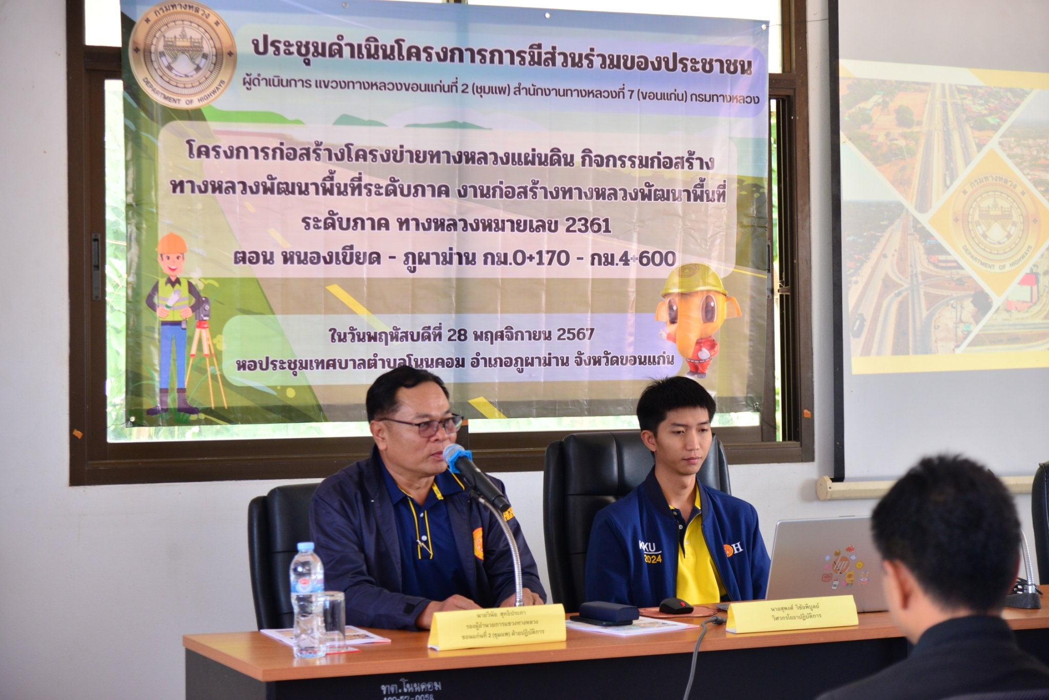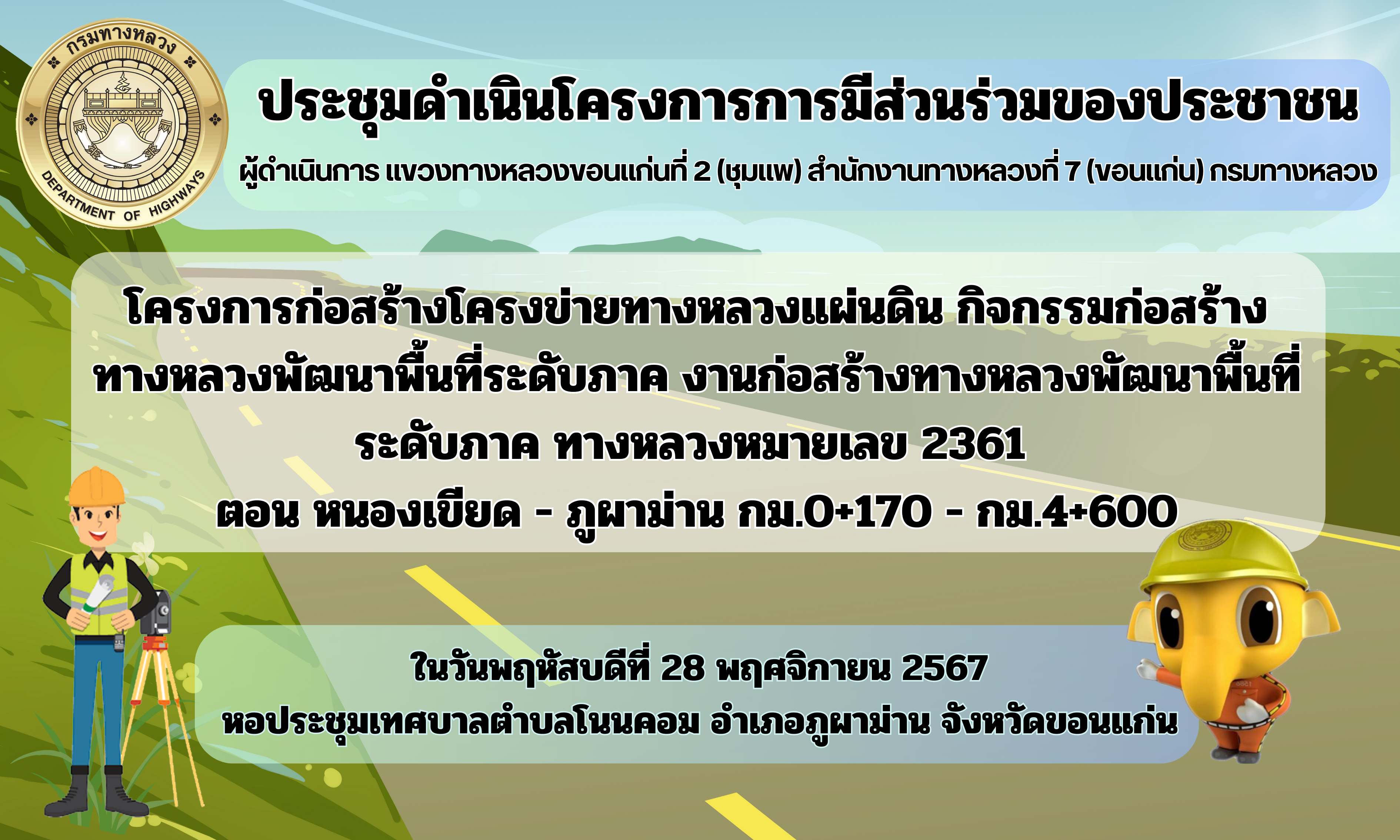 5 28/11/2567 ประชุมดำเนินโครงการมีส่วนร่วมของประชาชน "โครงการก่อสร้างโครงข่ายทางหลวงแผ่นดิน กิจกรรมก่อสร้างทางหลวงพัฒนาพื้นที่ระดับภาค งานก่อสร้างทางหลวงพัฒนาพื้นที่ระดับภาค ทางหลวงหมายเลข 2361 ตอนหนองเขียด - ภูผาม่าน กม.0+170 - กม.4+600"
