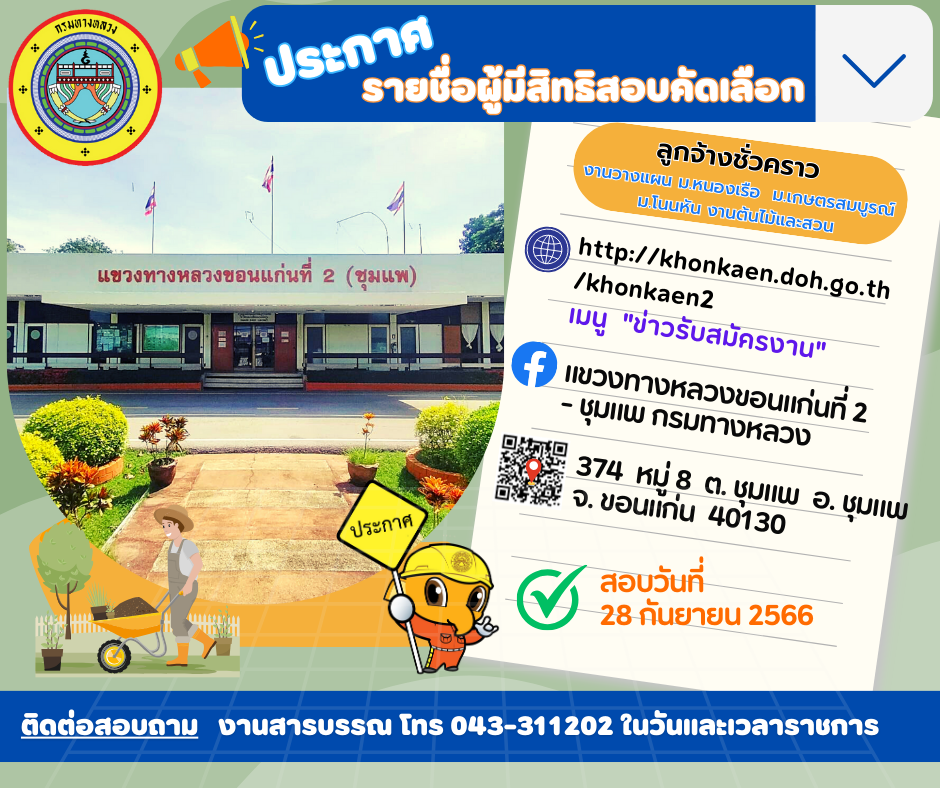 ประกาศรายชื่อผู้มีสิทธิสอบคัดเลือกลูกจ้างชั่วคราวรายวัน (คนงาน) ปฏิบัติงาน งานวางแผน หมวดทางหลวงหนองเรือ หมวดทางหลวงเกษตรสมบูรณ์ หมวดทางหลวงโนนหัน และงานต้นไม้และสวน