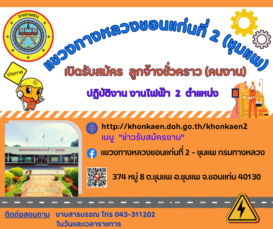 ด้วยแขวงทางหลวงขอนแก่นที่ 2 (ชุมแพ) สังกัดสำนักงานทางหลวงที่ 7 มีความประสงค์จะดำเนินการรับสมัครสอบคัดเลือกบุคคลเพื่อจ้างเป็นลูกจ้างชั่วคราวรายวัน ตำแหน่งคนงาน ปฏิบัติงาน งานไฟฟ้า ฝ่ายวิศวกรรม แขวงทางหลวงขอนแก่นที่ 2 (ชุมแพ) จำนวน 2 ตำแหน่ง รายละเอียดตามเอกสารแนบ