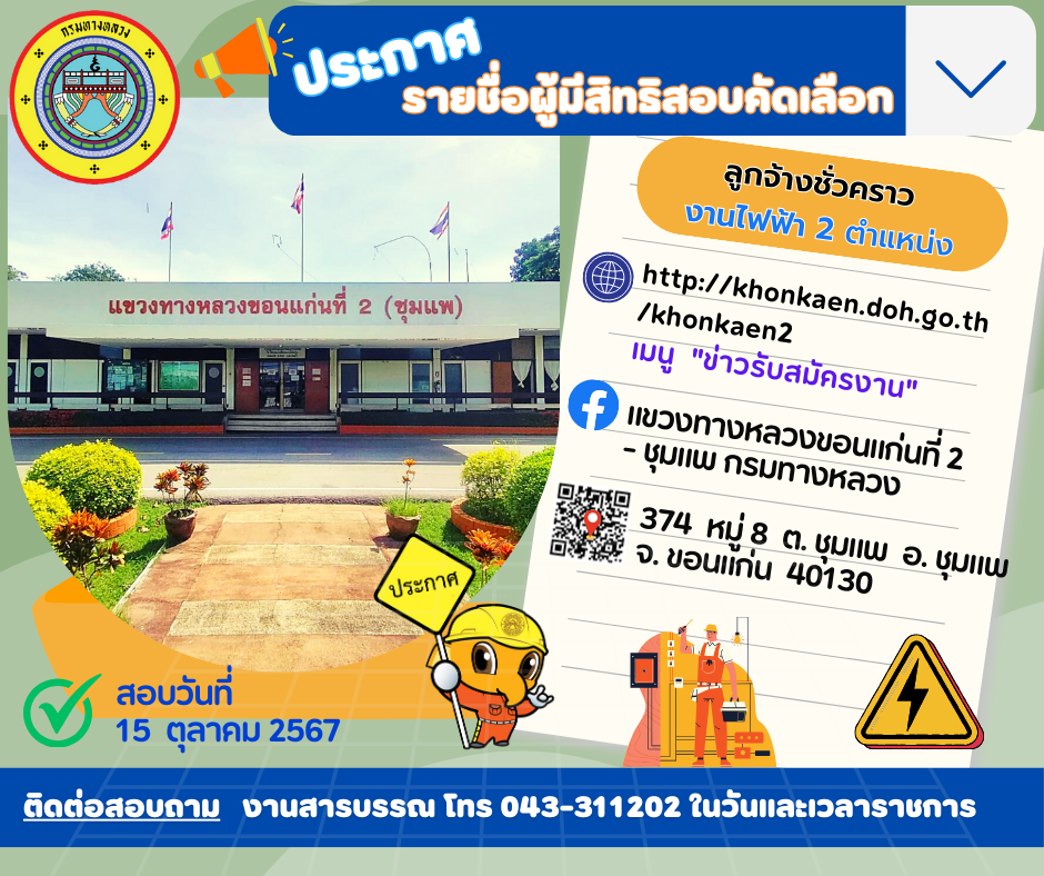 ตามประกาศ แขวงทางหลวงขอนแก่นที่ 2 (ชุมแพ) ลงวันที่ 1 ตุลาคม 2567 ได้ประกาศรับสมัครลูกจ้างชั่วคราวรายวันเพื่อปฏิบัติงาน งานไฟฟ้า แขวงทางหลวงขอนแก่นที่ 2 (ชุมแพ) โดยเริ่มรับสมัครตั้งแต่ วันที่ 1 ตุลาคม พ.ศ.2567 ถึงวันที่ 9 ตุลาคม พ.ศ.2567