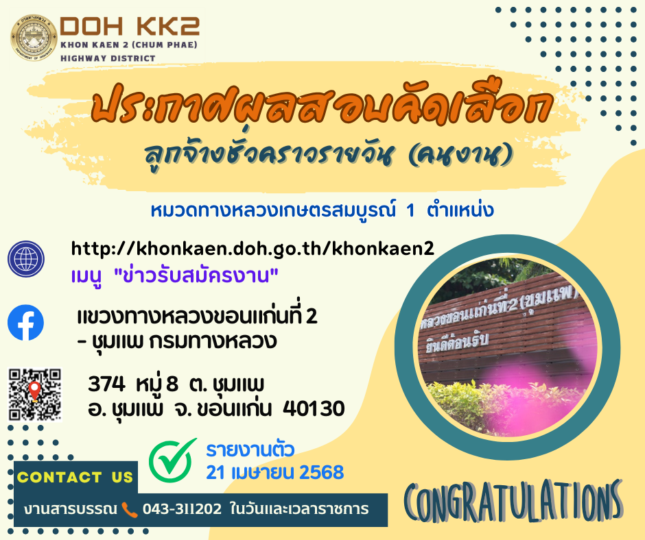 ตามที่ แขวงทางหลวงขอนแก่นที่ ๒(ชุมแพ) ได้ดําเนินการรับสมัครคัดเลือกลูกจ้างชั่วคราวรายวัน ตามประกาศที่ รับสมัคร ลงวันที่ ๑เมษายน ๒๕๖๘ จํานวน ๑ อัตรา ปฏิบัติงานหมวดทางหลวงเกษตรสมบูรณ์ แขวงทางหลวงขอนแก่นที่ ๒( ชุมแพ) นั้น บัดนี้ คณะกรรมการได้ดําเนินการประเมินสอบคัดเลือกเสร็จสิ้นแล้ว ในวันที่ ๑๗ เมษายน ๒๕๖๘ จึงประกาศรายชื่อผู้ผ่านการคัดเลือกลูกจ้างชั่วคราวรายวัน ตามรายละเอียดแนบมาพร้อมนี้