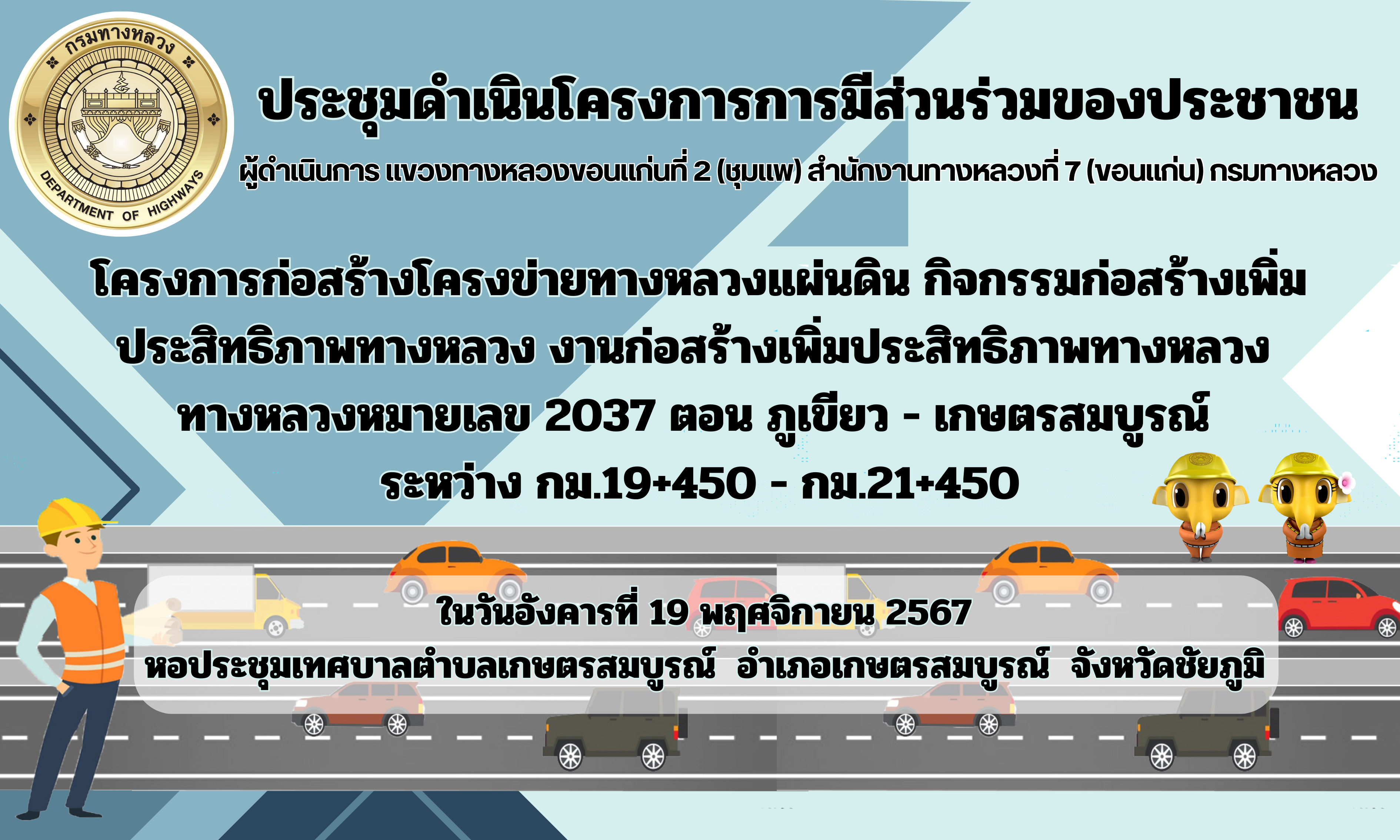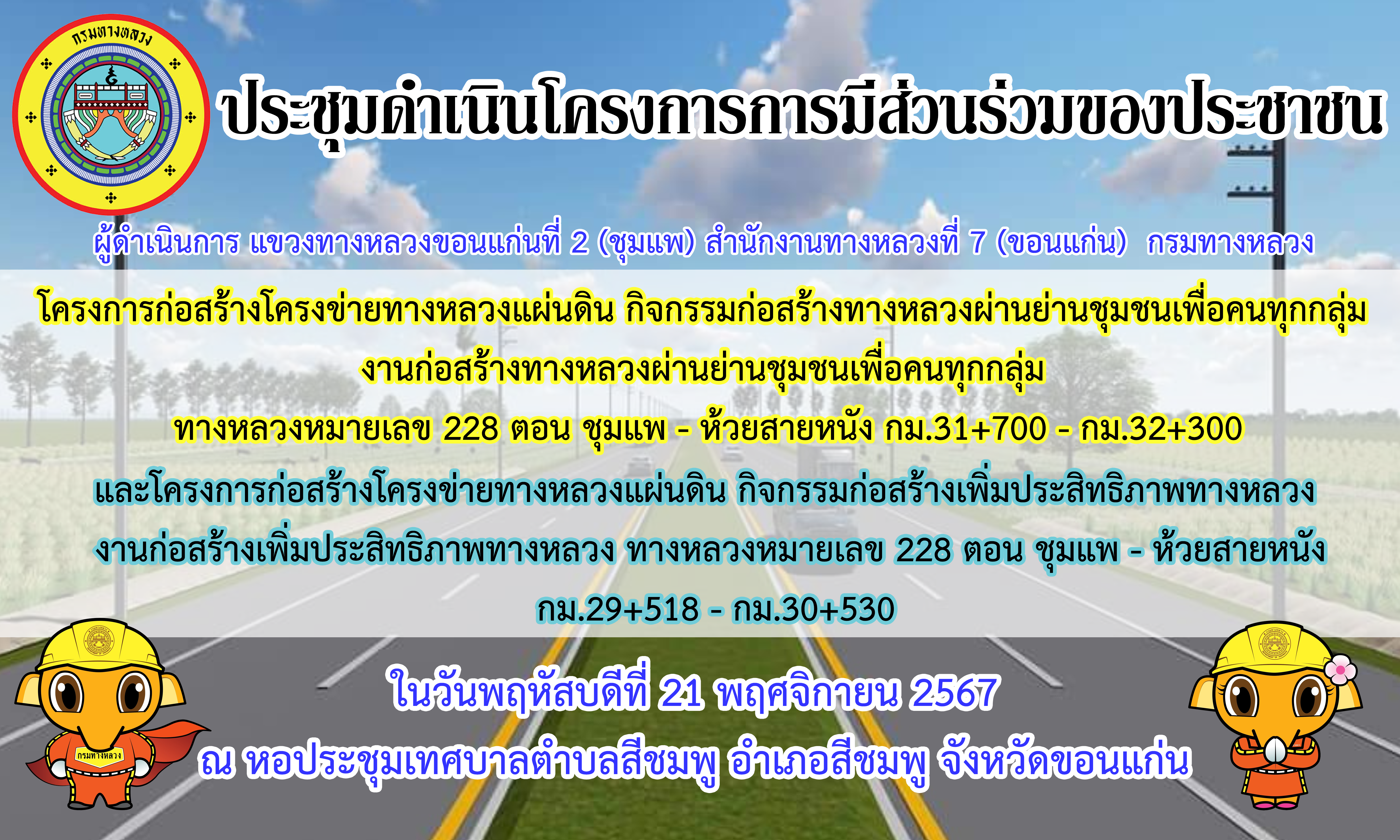 โครงการก่อสร้างโครงข่ายทางหลวงแผ่นดิน กิจกรรมก่อสร้างทางหลวงผ่านย่านชุมชนเพื่อคนทุกกลุ่ม งานก่อสร้างทางหลวงผ่านย่านชุมชนเพื่อคนทุกกลุ่ม ทล. 228 ตอน ชุมแพ - ห้วยสายหนัง