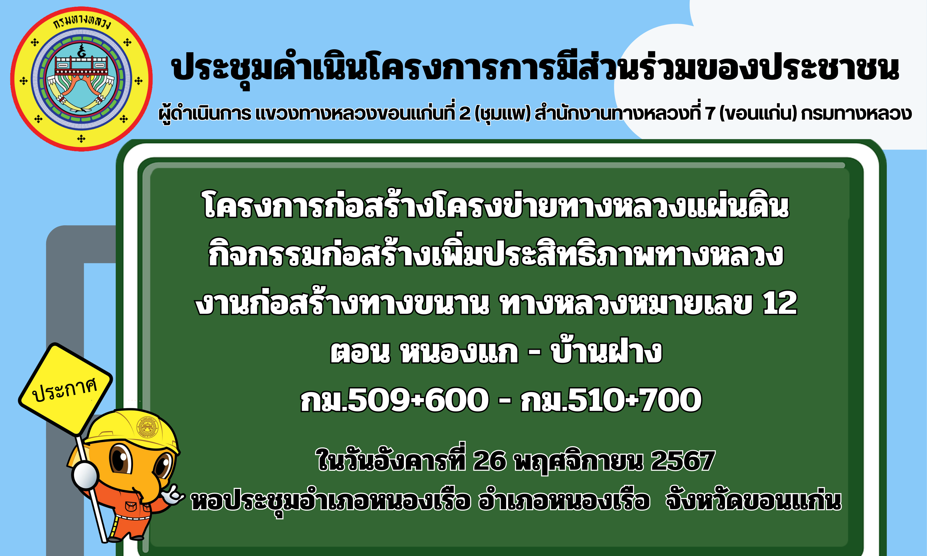 โครงการก่อสร้างโครงข่ายทางหลวงแผ่นดิน กิจกรรมก่อสร้างเพิ่มประสิทธิภาพทางหลวง        งานก่อสร้างทางขนาน ทล. 12 ตอน หนองแก - บ้านฝาง  กม.509+600 - กม.510+700