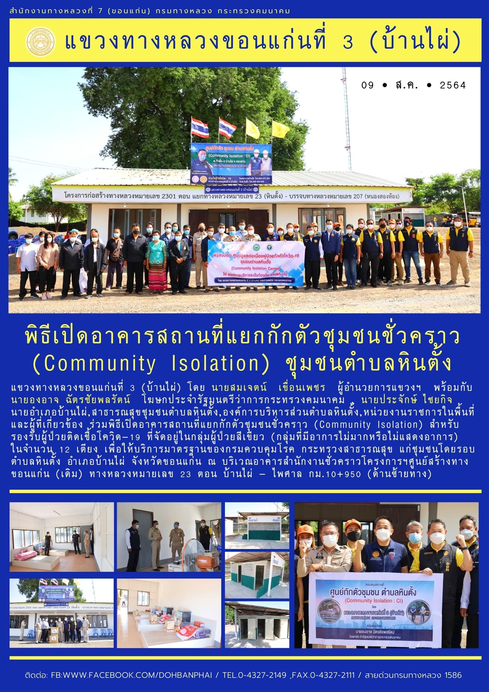แขวงทางหลวงขอนแก่นที่ 3 (บ้านไผ่) โดย นายสมเจตน์ เขื่อนเพชร ผู้อำนวยการแขวงฯ พร้อมกับ นายองอาจ ฉัตรชัยพลรัตน์ โฆษกประจำรัฐมนตรีว่าการกระทรวงคมนาคม นายประจักษ์ ไชยกิจ นายอำเภอบ้านไผ่,สาธารณสุขชุมชนตำบลหินตั้ง,องค์การบริหารส่วนตำบลหินตั้ง,หน่วยงานราชการในพื้นที่และผู้ที่เกี่ยวข้อง ร่วมพิธีเปิดอาคารสถานที่แยกกักตัวชุมชนชั่วคราว (Communilty lsolation) สำหรับรองรับผู้ป่วยติดเชื้อโควิด-19 ที่จัดอยู่ในกลุ่มผู้ป่วยสีเขียว (กลุ่มที่มีอาการไม่มากหรือไม่แสดงอาการ) ในจำนวน 12 เตียง เพื่อให้บริการมาตรฐานของกรมควบคุมโรค กระทรวงสาธารณสุข แก่ชุมชนโดยรอบ ตำบลหินตั้ง อำเภอบ้านไผ่ จังหวัดขอนแก่น ณ บริเวณอาคารสำนักงานชั่วคราวโครงการศูนย์สร้างทางขอนแก่น (เดิม) ทางหลวงหมายดลข 23 บ้านไผ่-ไพศาล กม.10+950 (ด้านซ้ายทาง)