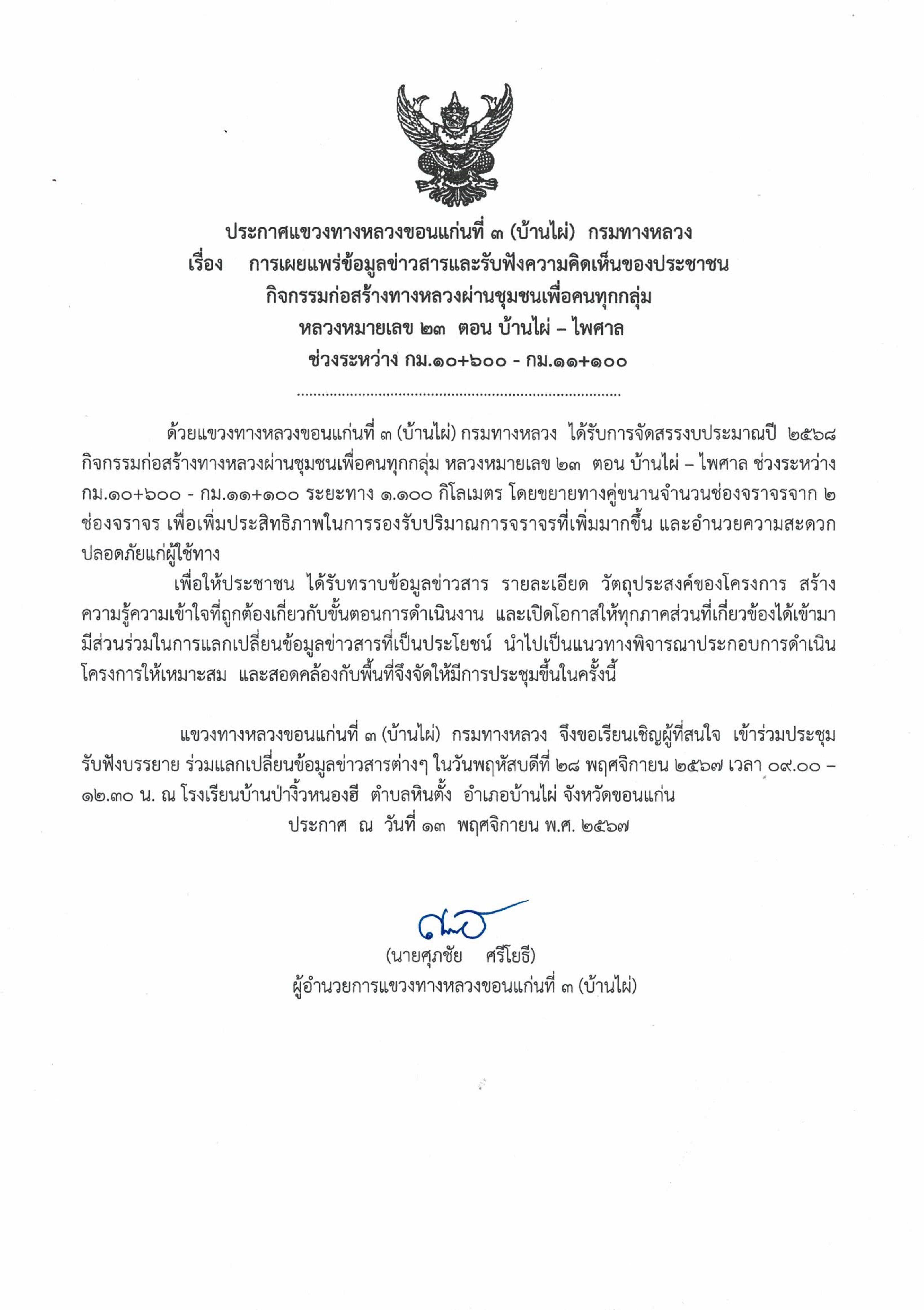 ด้วยแขวงทางหลวงขอนแก่นที่ ๓ (บ้านไผ่) กรมทางหลวง ได้รับการจัดสรรงบประมาณปี 2568กิจกรรมก่อสร้างทางหลวงผ่านชุมชนเพื่อคนทุกกลุ่ม หลวงหมายเลข 23 ตอน บ้านไผ่ – ไพศาล ช่วงระหว่าง กม.10+600 - กม.11+100 ระยะทาง 1.100 กิโลเมตร โดยขยายทางคู่ขนานจำนวนช่องจราจรจาก 2 ช่องจราจร เพื่อเพิ่มประสิทธิภาพในการรองรับปริมาณการจราจรที่เพิ่มมากขึ้น และอำนวยความสะดวกปลอดภัยแก่ผู้ใช้ทางเพื่อให้ประชาชน ได้รับทราบข้อมูลข่าวสาร รายละเอียดวัตถุประสงค์ของโครงการ สร้างความรู้ความเข้าใจที่ถูกต้องเกี่ยวกับขั้นตอนการดำเนินงาน และเปิดโอกาสให้ทุกภาคส่วนที่เกี่ยวข้องได้เข้ามามีส่วนร่วมในการแลกเปลี่ยนข้อมูลข่าวสารที่เป็นประโยชน์ นำไปเป็นแนวทางพิจารณาประกอบการดำเนินโครงการใหhเหมาะสม และสอดคล้องกับพื้นที่จึงจัดให้มีการประชุมขึ้นในครั้งนี้