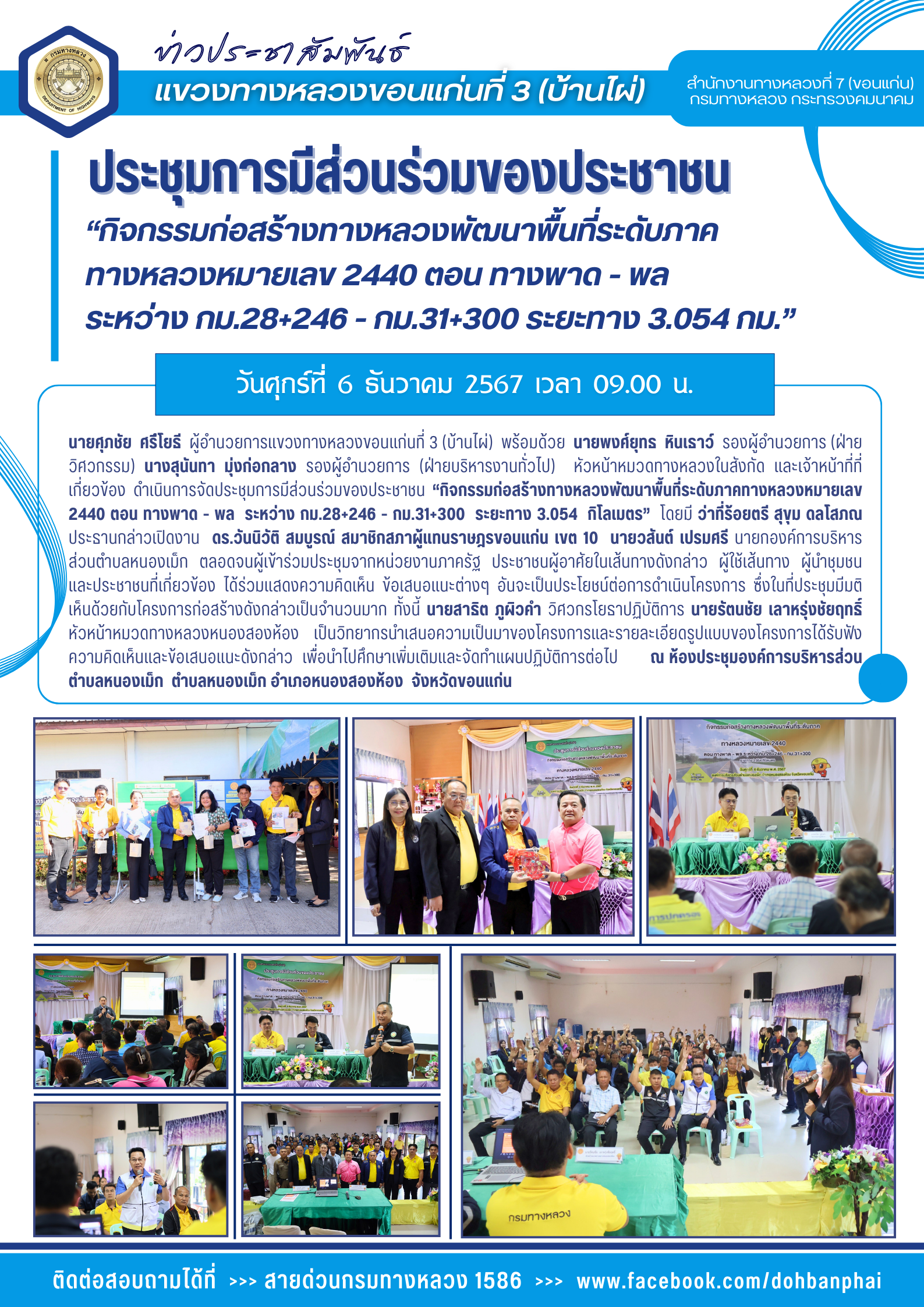 #นายศุภชัย ศรีึโยธี ผู้อำนวยการแขวงทางหลวงขอนแก่นที่ 3 (บ้านไผ่) พร้อมด้วย นายพงศ์ยุทธ หินเธาว์ รองผู้อำนวยการ (ฝ่ายวิศวกรรม) นางสุนันทา มุ่งก่อกลาง รองผู้อำนวยการ (ฝ่ายบริหารงานทั่วไป) หัวหน้าหมวดทางหลวงในสังกัด และเจ้าหน้าที่ที่เกี่ยวข้อง ดำเนินการจัดประชุมการมีส่วนร่วมของประชาชน “กิจกรรมก่อสร้างทางหลวงพัฒนาพื้นที่ระดับภาคทางหลวงหมายเลข 2440 ตอน ทางพาด - พล ระหว่าง กม.28+246 - กม.31+300 ระยะทาง 3.054 กิโลเมตร” โดยมี ว่าที่ร้อยตรี สุขุม ดลโสภณ ประธานกล่าวเปิดงาน ดร.วันนิวัติ สมบูรณ์ สมาชิกสภาผู้แทนราษฎรขอนแก่น เขต 10 นายวสันต์ เปรมศรี นายกองค์การบริหารส่วนตำบลหนองเม็ก ตลอดจนผู้เข้าร่วมประชุมจากหน่วยงานภาครัฐ ประชาชนผู้อาศัยในเส้นทางดังกล่าว ผู้ใช้เส้นทาง ผู้นำชุมชน และประชาชนที่เกี่ยวข้อง ได้ร่วมแสดงความคิดเห็น ข้อเสนอแนะต่างๆ อันจะเป็นประโยชน์ต่อการดำเนินโครงการ ซึ่งในที่ประชุมมีมติเห็นด้วยกับโครงการก่อสร้างดังกล่าวเป็นจำนวนมาก ทั้งนี้ นายสาธิต ภูผิวคำ วิศวกรโยธาปฏิบัติการ นายรัตนชัย เลาหรุ่งชัยฤทธิ์ หัวหน้าหมวดทางหลวงหนองสองห้อง เป็นวิทยากรนำเสนอความเป็นมาของโครงการและรายละเอียดรูปแบบของโครงการได้รับฟังความคิดเห็นและข้อเสนอแนะดังกล่าว เพื่อนำไปศึกษาเพิ่มเติมและจัดทำแผนปฏิบัติการต่อไป ณ ห้องประชุมองค์การบริหารส่วนตำบลหนองเม็ก ตำบลหนองเม็ก อำเภอหนองสองห้อง จังหวัดขอนแก่น