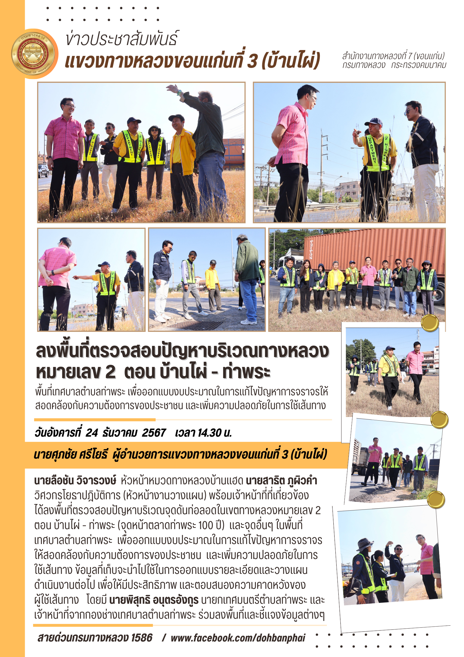 ได้ลงพื้นที่ตรวจสอบปัญหาบริเวณจุดดันท่อลอดในเขตทางหลวงหมายเลข 2 ตอน บ้านไผ่ - ท่าพระ (จุดหน้าตลาดท่าพระ 100 ปี) และจุดอื่นๆ ในพื้นที่เทศบาลตำบลท่าพระ เพื่อออกแบบงบประมาณในการแก้ไขปัญหาการจราจรให้สอดคล้องกับความต้องการของประชาชน และเพิ่มความปลอดภัยในการ