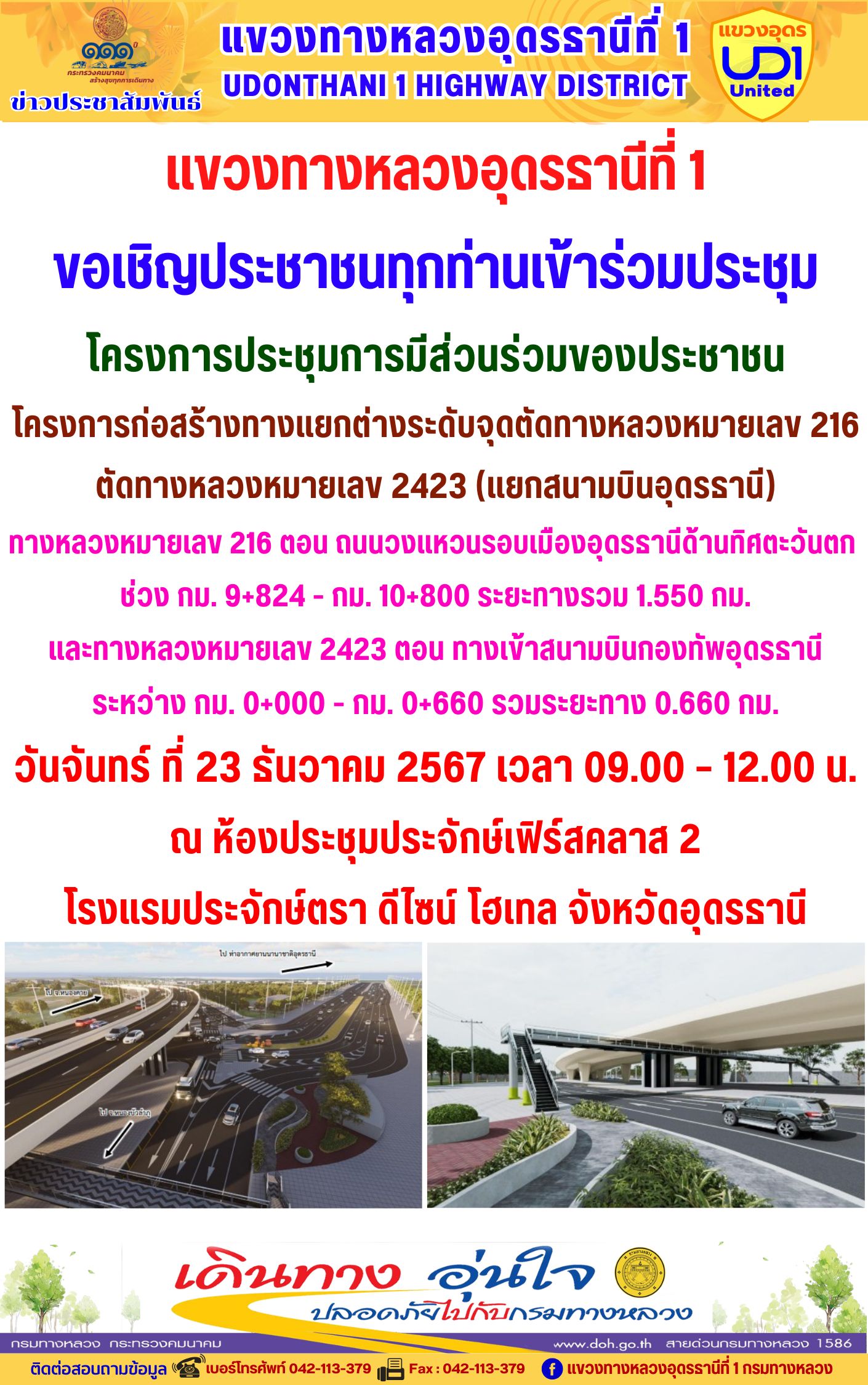 ขอเชิญประชาชนทุกท่านเข้าร่วมประชุม โครงก?ารประชุมการมีส่วนร่วมของประชาชน โครงการก่อสร้างทางแยกต่างระดับจุดตัดทางหลวงหมายเลข 216 ตัดทางหลวงหมายเลข 2423 (แยกสนามบินอุดรธานี)