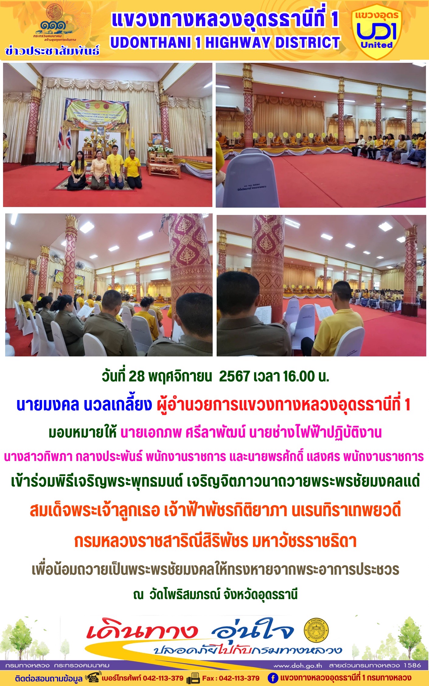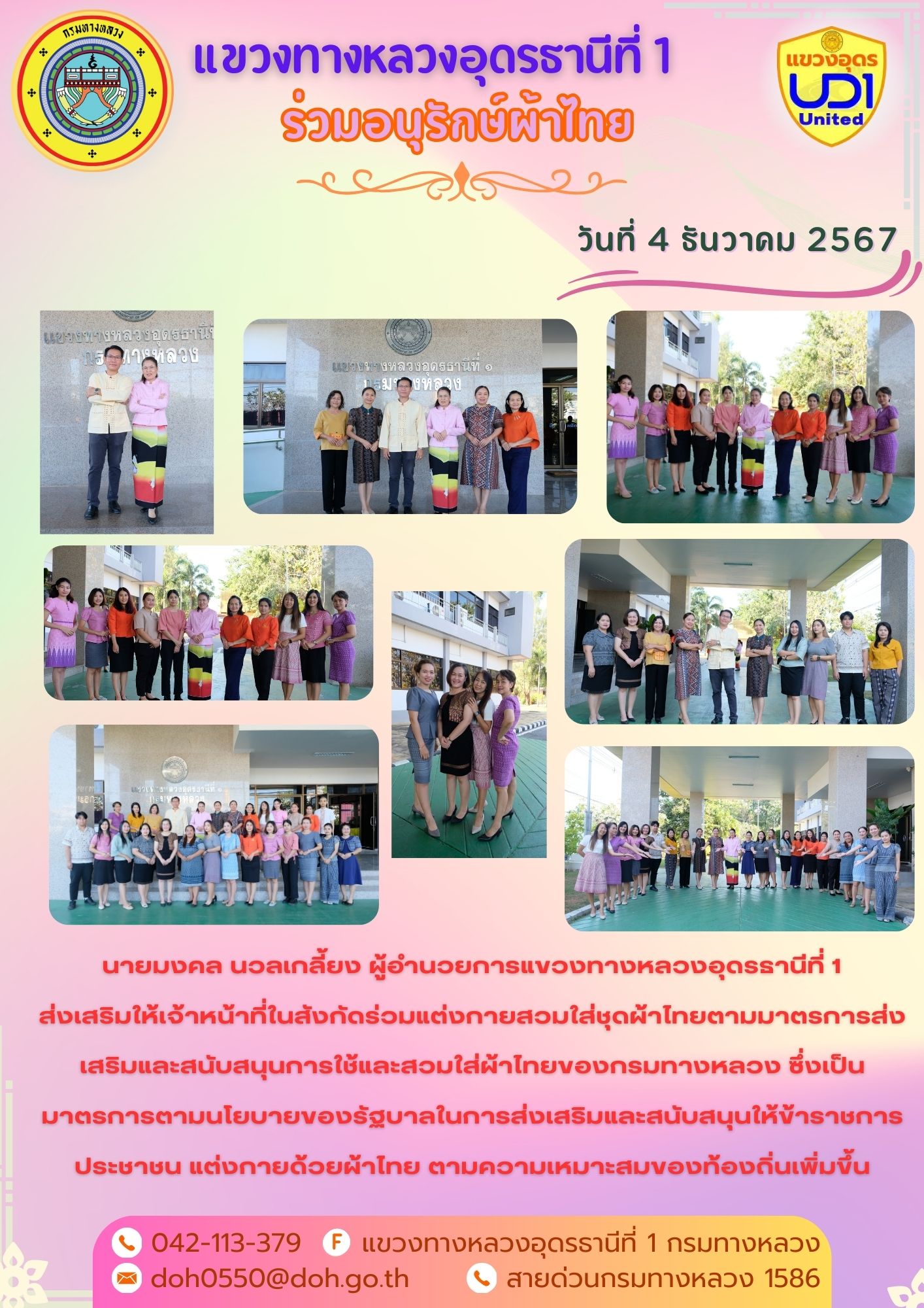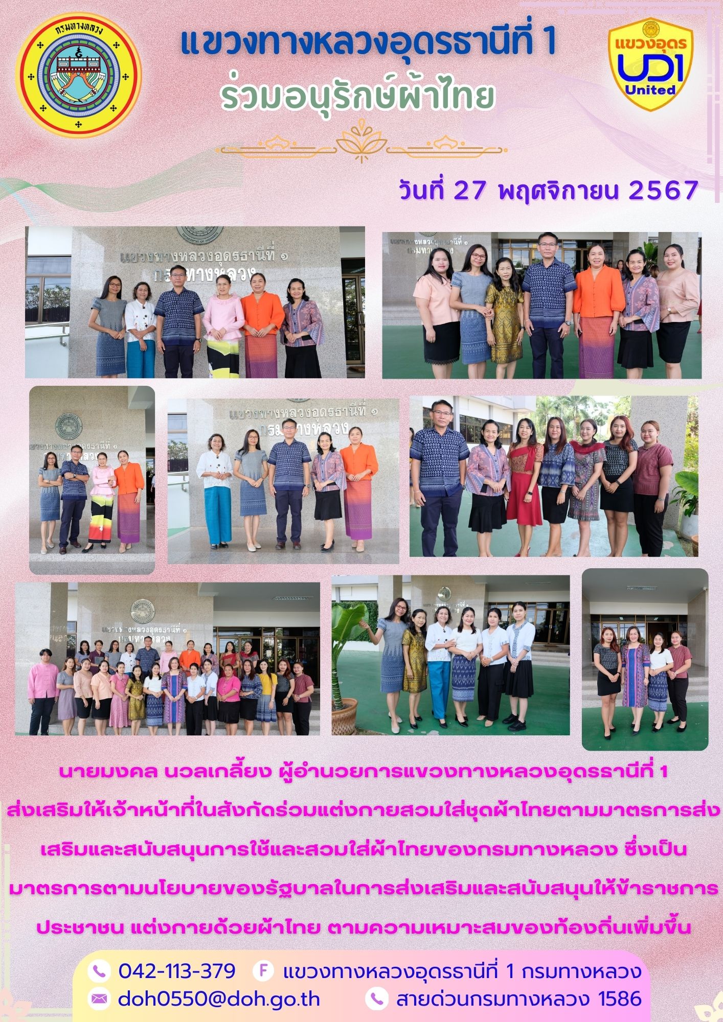 นายมงคล นวลเกลี้ยง ผู้อำนวยการแขวงทางหลวงอุดรธานีที่ 1 และเจ้าหน้าที่ในสังกัดร่วมแต่งกายสวมใส่ชุดผ้าไทยตามมาตรการส่งเสริมให้เจ้าหน้าที่ในสังกัดร่วมแต่งกายสวมใส่ชุดผ้าไทยตามมาตรการส่งเสริมและสนับสนุนการใช้และสวมใส่ผ้าไทยของกรมทางหลวง ซึ่งเป็นมาตรการตามนโยบายของรัฐบาลในการส่งเสริมและสนับสนุนให้ข้าราชการ ประชาชน แต่งกายด้วยผ้าไทย ตามความเหมาะสมของท้องถิ่นเพิ่มขึ้น