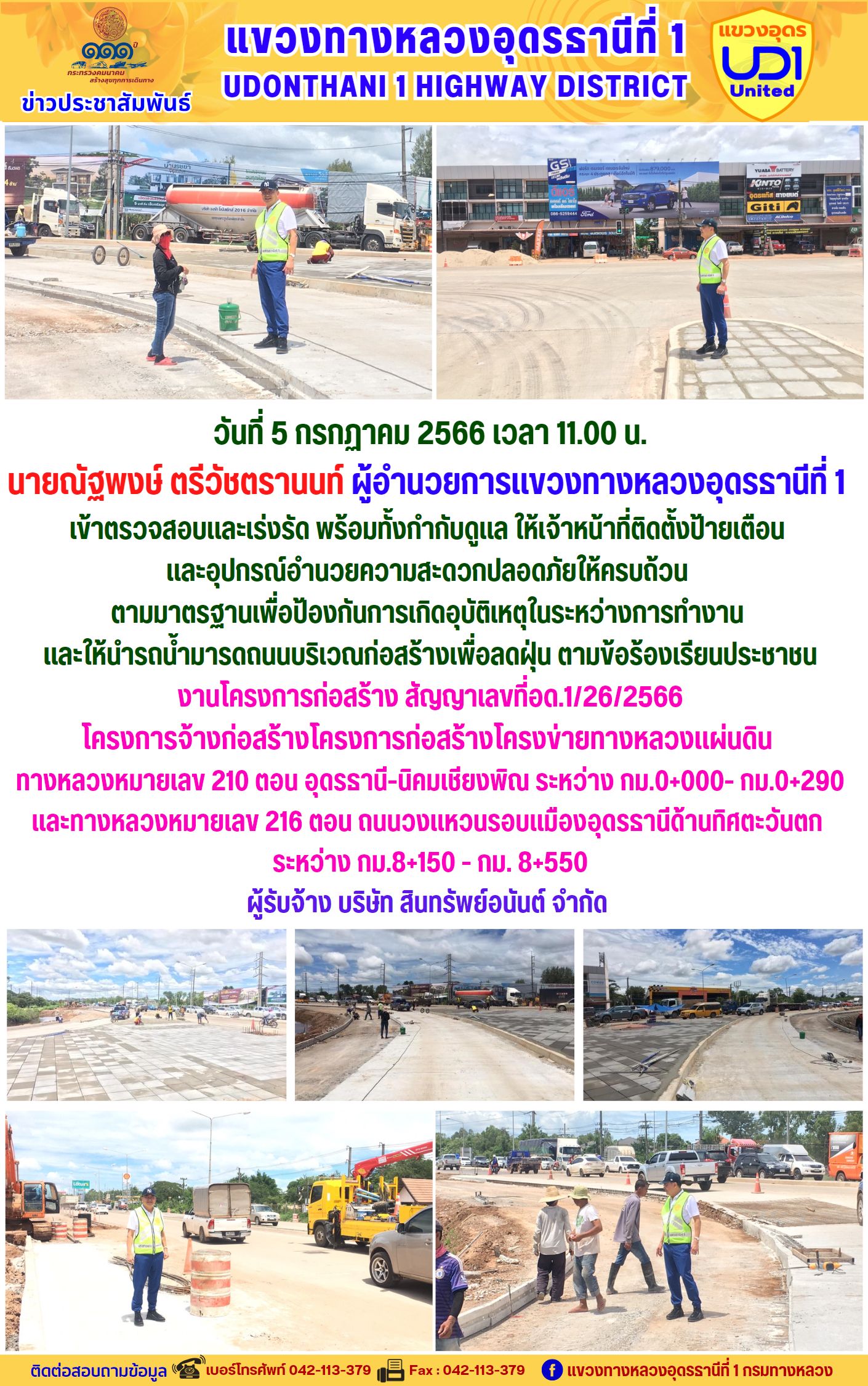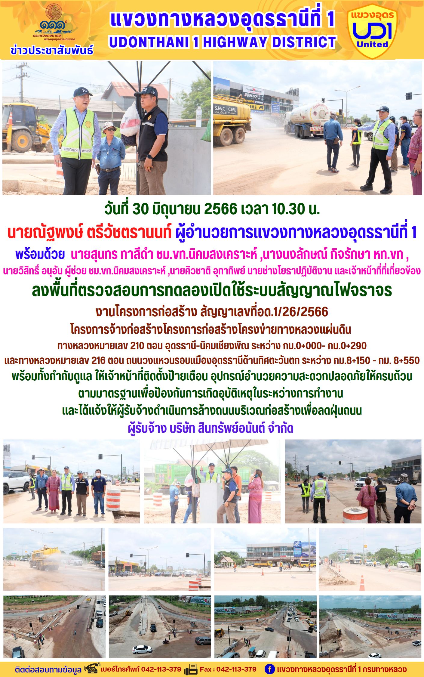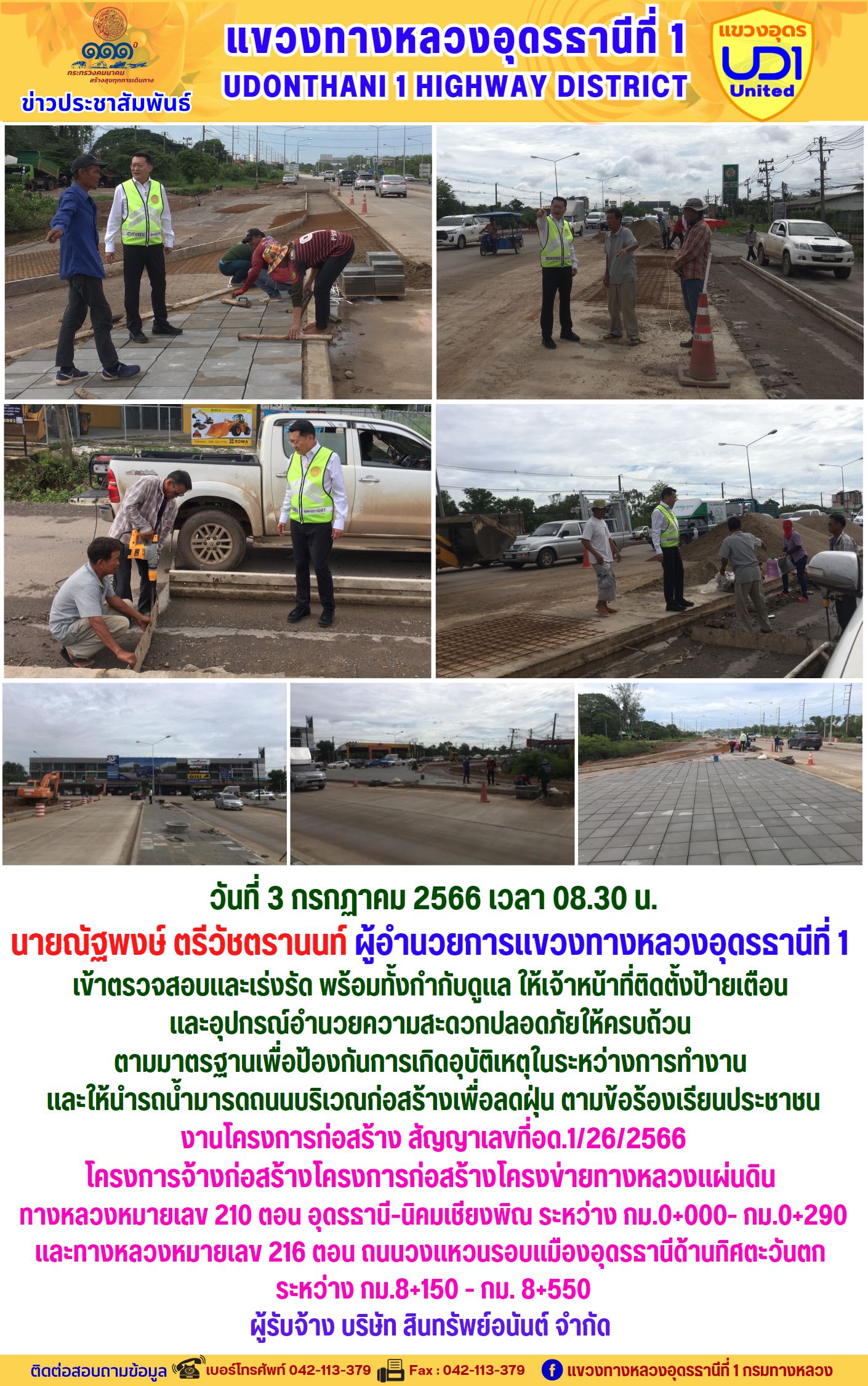 นายณัฐพงษ์ ตรีวัชตรานนท์ ผู้อำนวยการแขวงทางหลวงอุดรธานีที่ 1 เข้าตรวจสอบและเร่งรัด งานโครงการก่อสร้าง สัญญาเลขที่อด.1/26/2566 โครงการจ้างก่อสร้างโครงการก่อสร้างโครงข่ายทางหลวงแผ่นดิน ทางหลวงหมายเลข 210 ตอน อุดรธานี-นิคมเชียงพิณ ระหว่าง กม.0+000- กม.0+290 และทางหลวงหมายเลข 216 ตอน ถนนวงแหวนรอบแมืองอุดรธานีด้านทิศตะวันตก ระหว่าง กม.8+150 - กม. 8+550