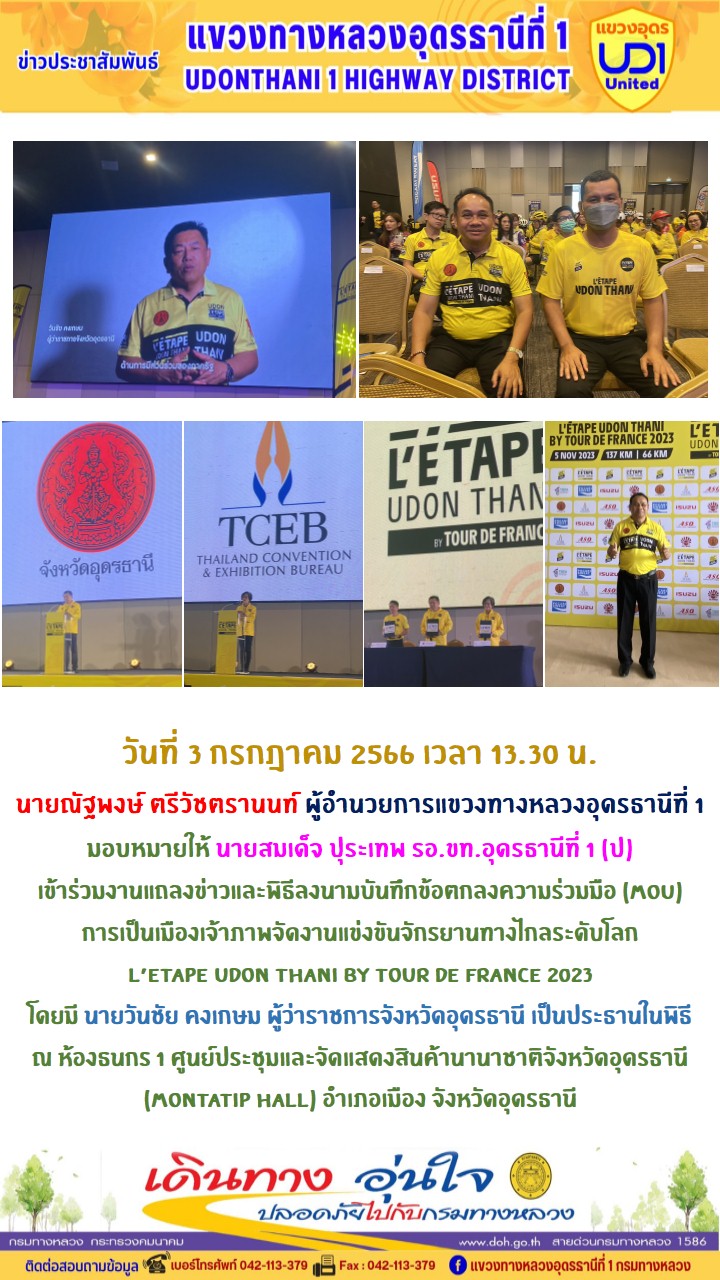 นายณัฐพงษ์ ตรีวัชตรานนท์ ผู้อำนวยการแขวงทางหลวงอุดรธานีที่ 1 มอบหมายให้ นายสมเด็จ ปุระเทพ รอ.ขท.อุดรธานีที่ 1 (ป) เข้าร่วมงานแถลงข่าวและพิธีลงนามบันทึกข้อตกลงความร่วมมือ (MOU) การเป็นเมืองเจ้าภาพจัดงานแข่งขันจักรยานทางไกลระดับโลก L’Etape Udon Thani by Tour de France 2023 ณ ห้องธนกร 1 ศูนย์ประชุมและจัดแสดงสินค้านานาชาติจังหวัดอุดรธานี (MONTATIP HALL) อำเภอเมือง จังหวัดอุดรธานี