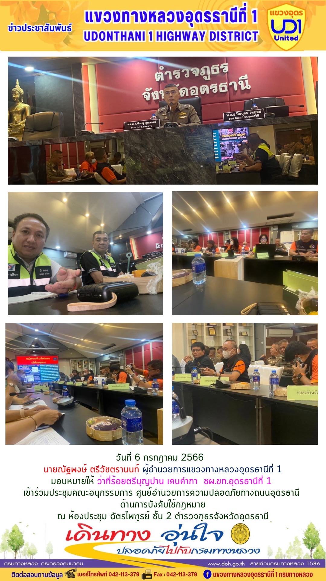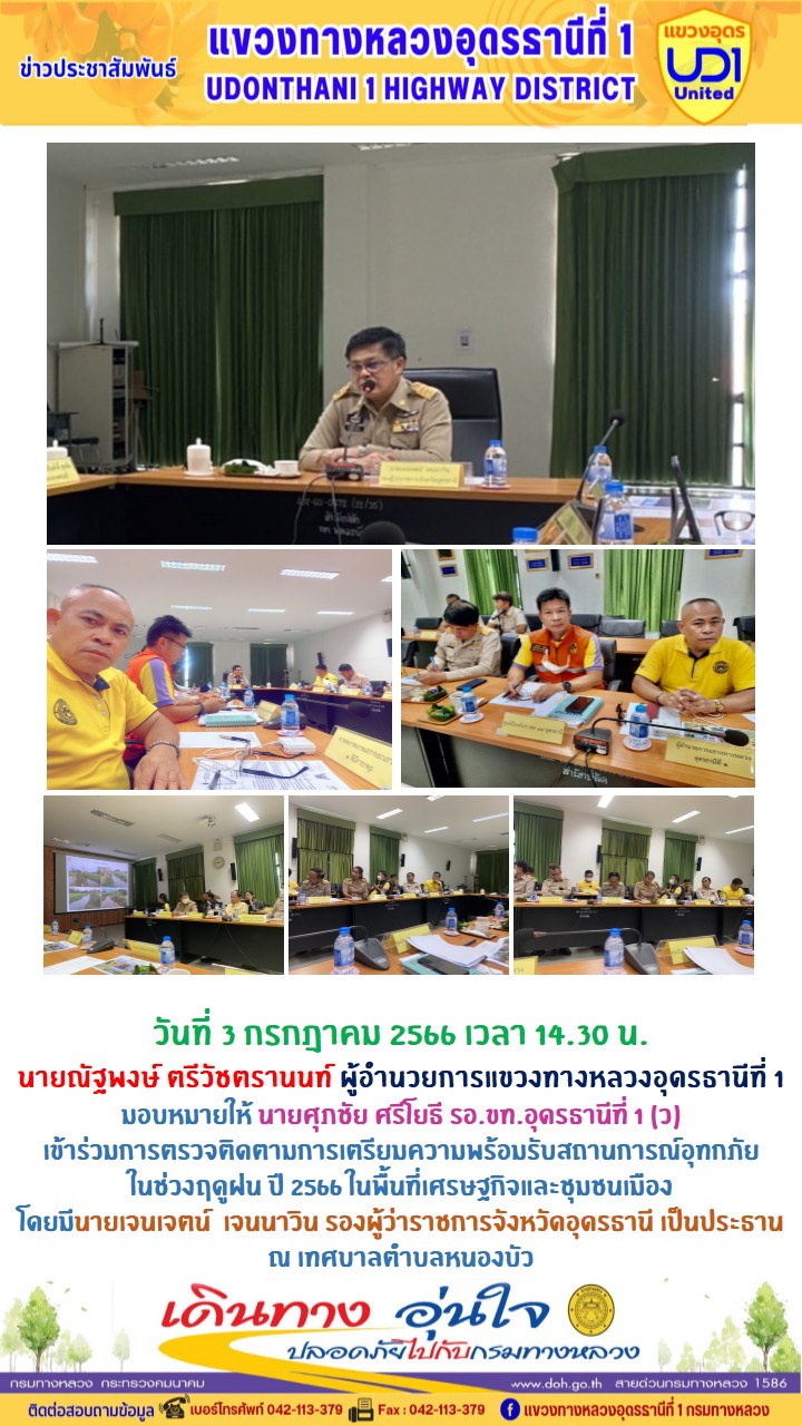 นายณัฐพงษ์ ตรีวัชตรานนท์ ผู้อำนวยการแขวงทางหลวงอุดรธานีที่ 1 มอบหมายให้ นายศุภชัย ศรีโยธี รอ.ขท.อุดรธานีที่ 1 (ว) เข้าร่วมประชุมคณะทำงานติดตามสถานการณ์และการบริหารจัดการน้ำ (อุทกภัย) ปี 2566) ครั้งที่ 3/2566 ณ ห้องประชุมพระยาศรีสุริยราชวราวัตร (โพธิ์ เนติโพธิ์) อาคาร 1 ชั้น 3 ศาลากลางจังหวัดอุดรธานี