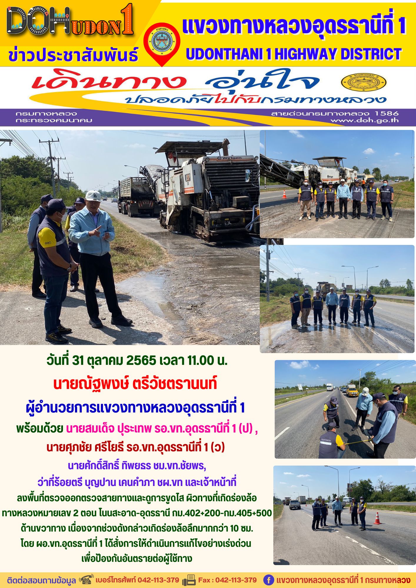 นายณัฐพงษ์ ตรีวัชตรานนท์ ผู้อำนวยการแขวงทางหลวงอุดรธานีที่ 1 พร้อมด้วย นายสมเด็จ ปุระเทพ รอ.ขท.อุดรธานีที่ 1 (ป) , นายศุภชัย ศรีโยธี รอ.ขท.อุดรธานีที่ 1 (ว) นายศักดิ์สิทธิ์ ทิพยธร ชม.ขท.ชัยพร, ว่าที่ร้อยตรี บุญปาน เคนคำภา ชผ.ขท และเจ้าหน้าที่ ลงพื้นที่ตรวจออกตรวจสายทางและดูการขูดไส ผิวทางที่เกิดร่องล้อ ทางหลวงหมายเลข 2 ตอน โนนสะอาด-อุดรธานี กม.402+200-กม.405+500 ด้านขวาทาง