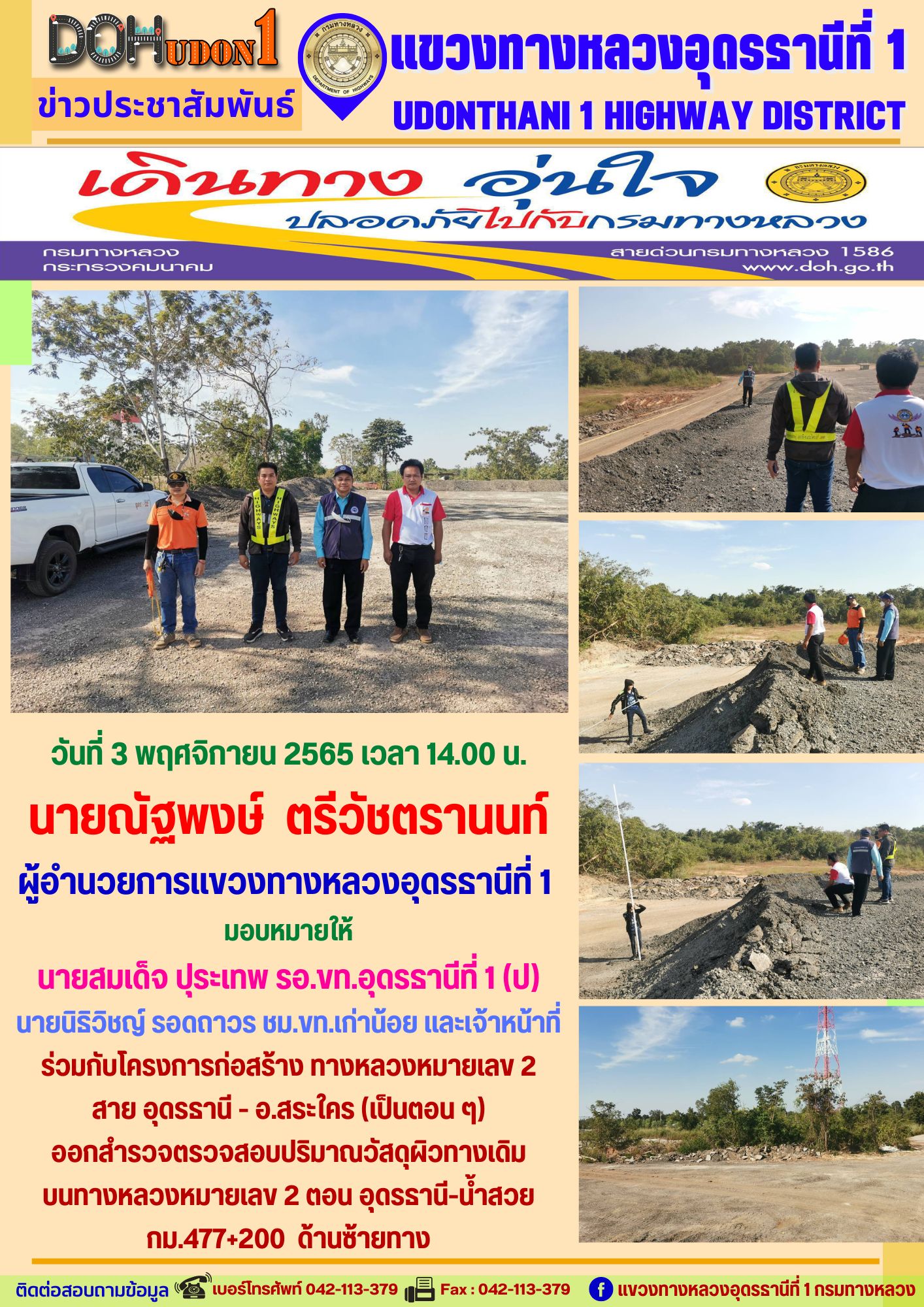 นายณัฐพงษ์ ตรีวัชตรานนท์ ผู้อำนวยการแขวงทางหลวงอุดรธานีที่ 1 มอบหมายให้ นายสมเด็จ ปุระเทพ รอ.ขท.อุดรธานีที่ 1 (ป)