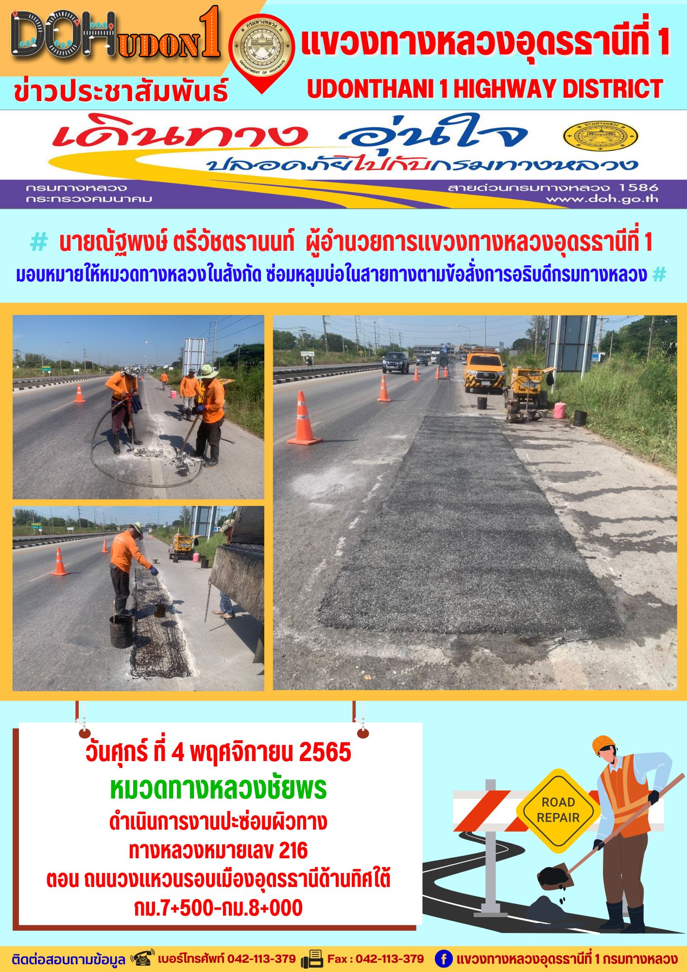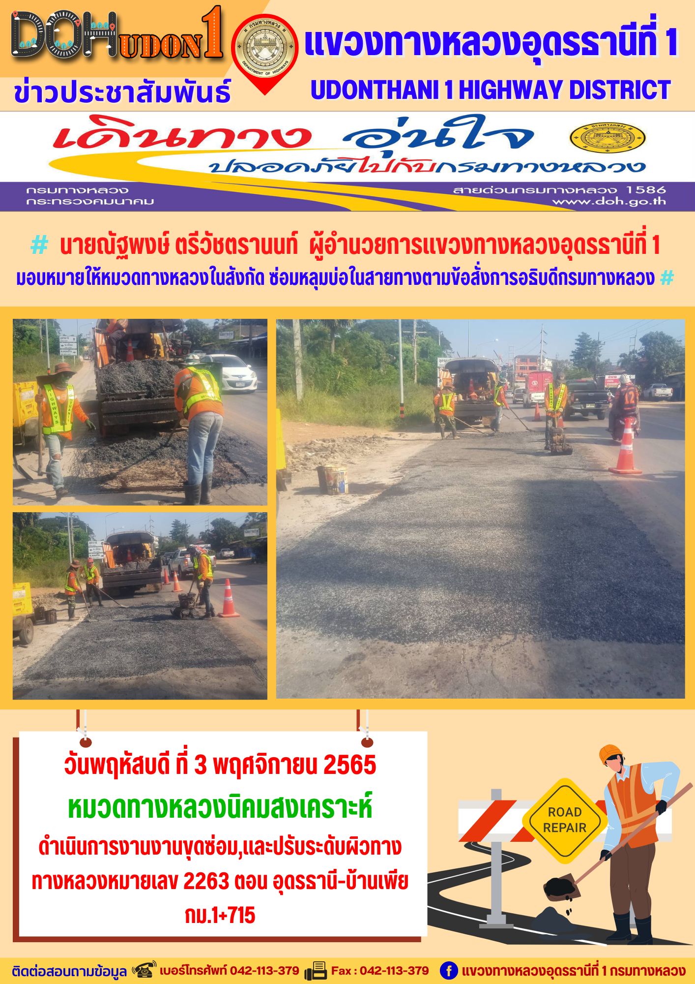 นายณัฐพงษ์ ตรีวัชตรานนท์ ผู้อำนวยการแขวงทางหลวงอุดรธานีที่ 1 มอบหมายให้ นายสมเด็จ ปุระเทพ รอ.ขท.อุดรธานีที่ 1 (ป) ลงพื้นที่เพื่อให้คำแนะนำ การซ่อมบำรุงผิวทาง งานปะซ่อมผิวทาง ให้กับผู้ปฎิบัติงาน