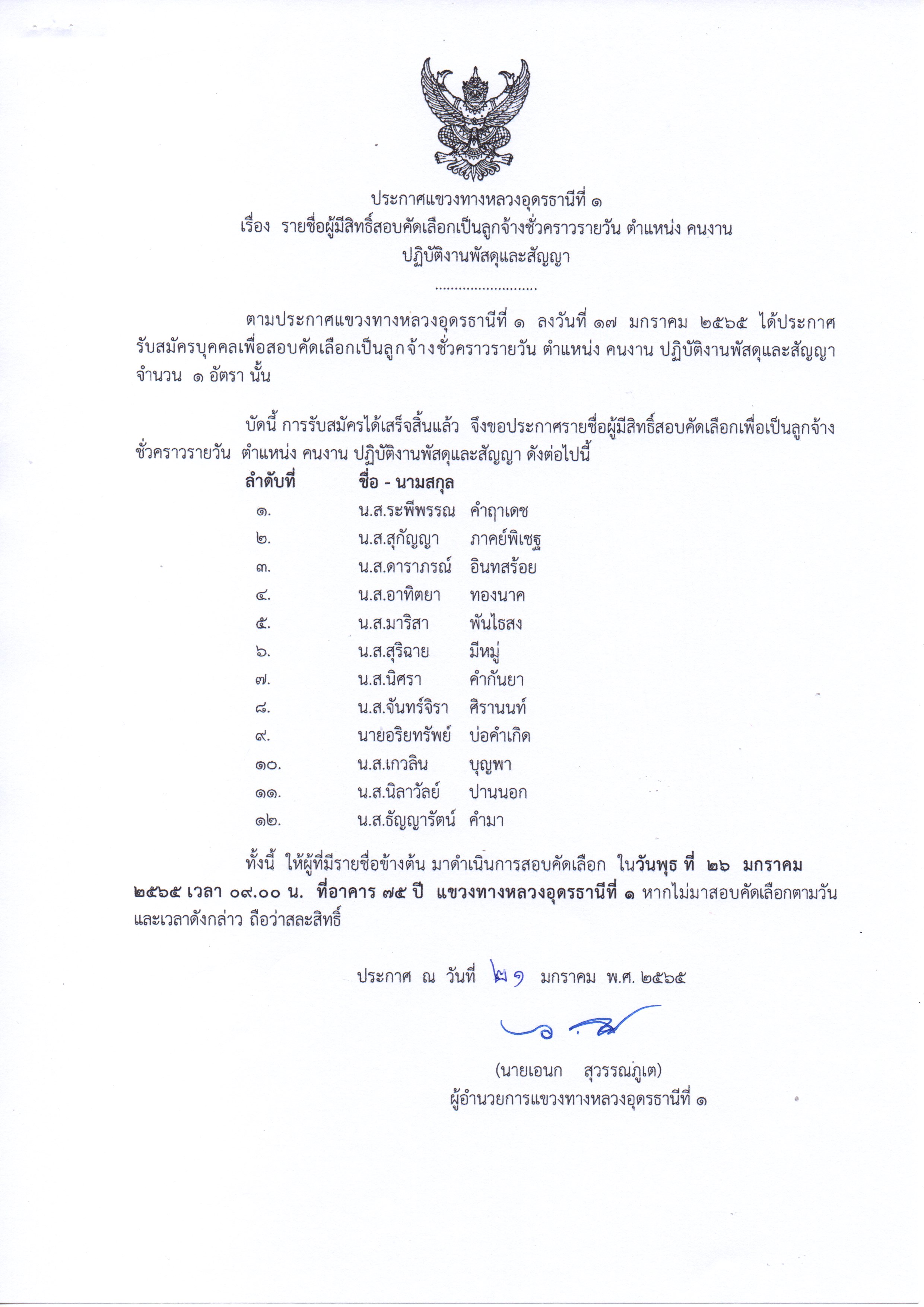 ประกาศรายชื่อผู้มีสิทธิสอบคัดเลือกเป็น ลูกจ้างชั่วคราว ตำแหน่ง คนงานเพื่อปฏิบัติงานพัสดุและสัญญา จำนวน 1 ตำแหน่ง