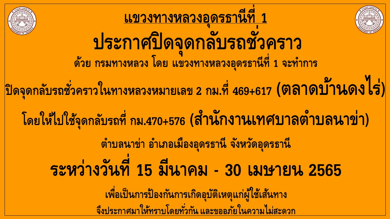 #ประกาศปิดจุดกลับรถชั่วคราว ด้วย กรมทางหลวง โดย แขวงทางหลวงอุดรธานีที่ 1 จะทำการ ปิดจุดกลับรถชั่วคราวในทางหลวงหมายเลข 2 กม.ที่ 469+617 (ตลาดบ้านดงไร่) โดยให้ไปใช้จุดกลับรถที่ กม.470+576 (สำนักงานเทศบาลตำบลนาข่า) ตำบลนาข่า อำเภอเมืองอุดรธานี จังหวัดอุดรธานี ระหว่างวันที่ 15 มีนาคม - 30 เมษายน 2565