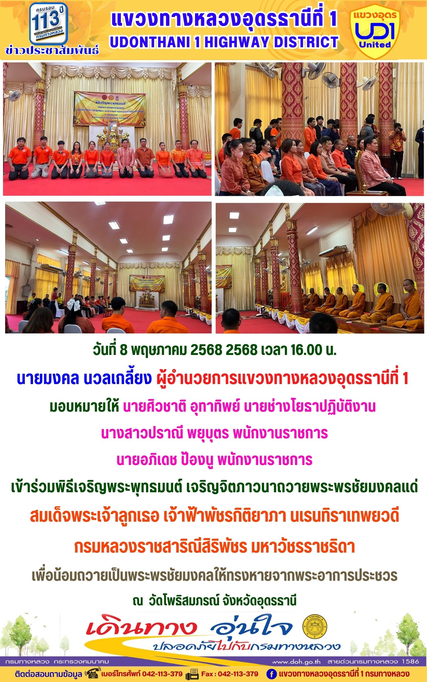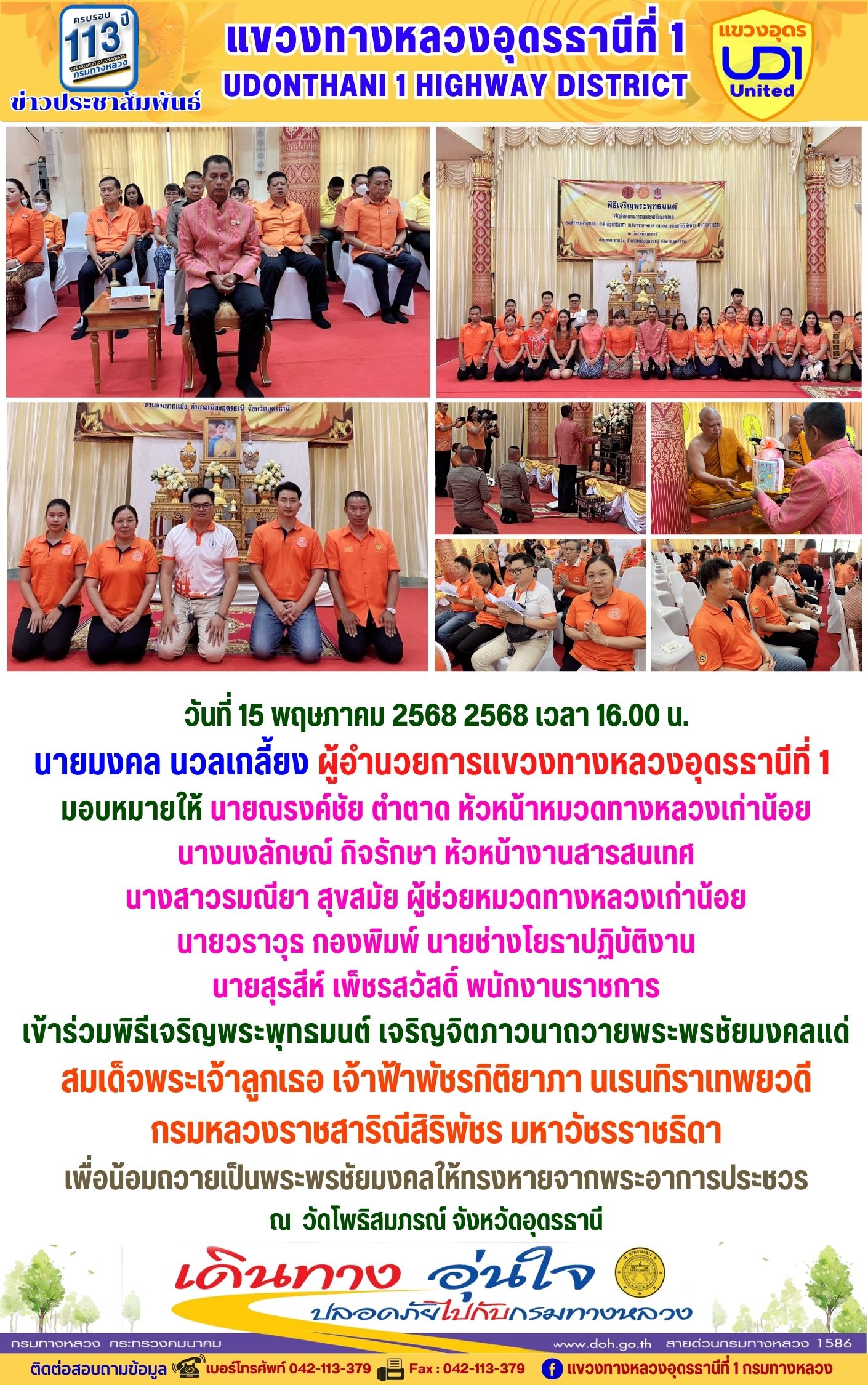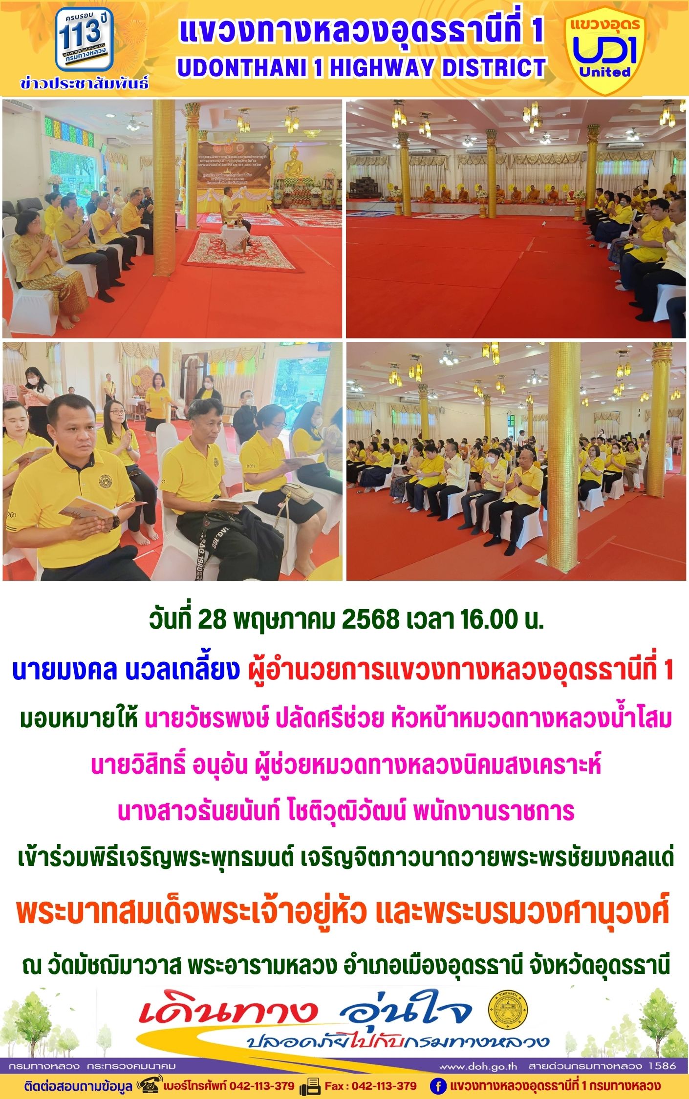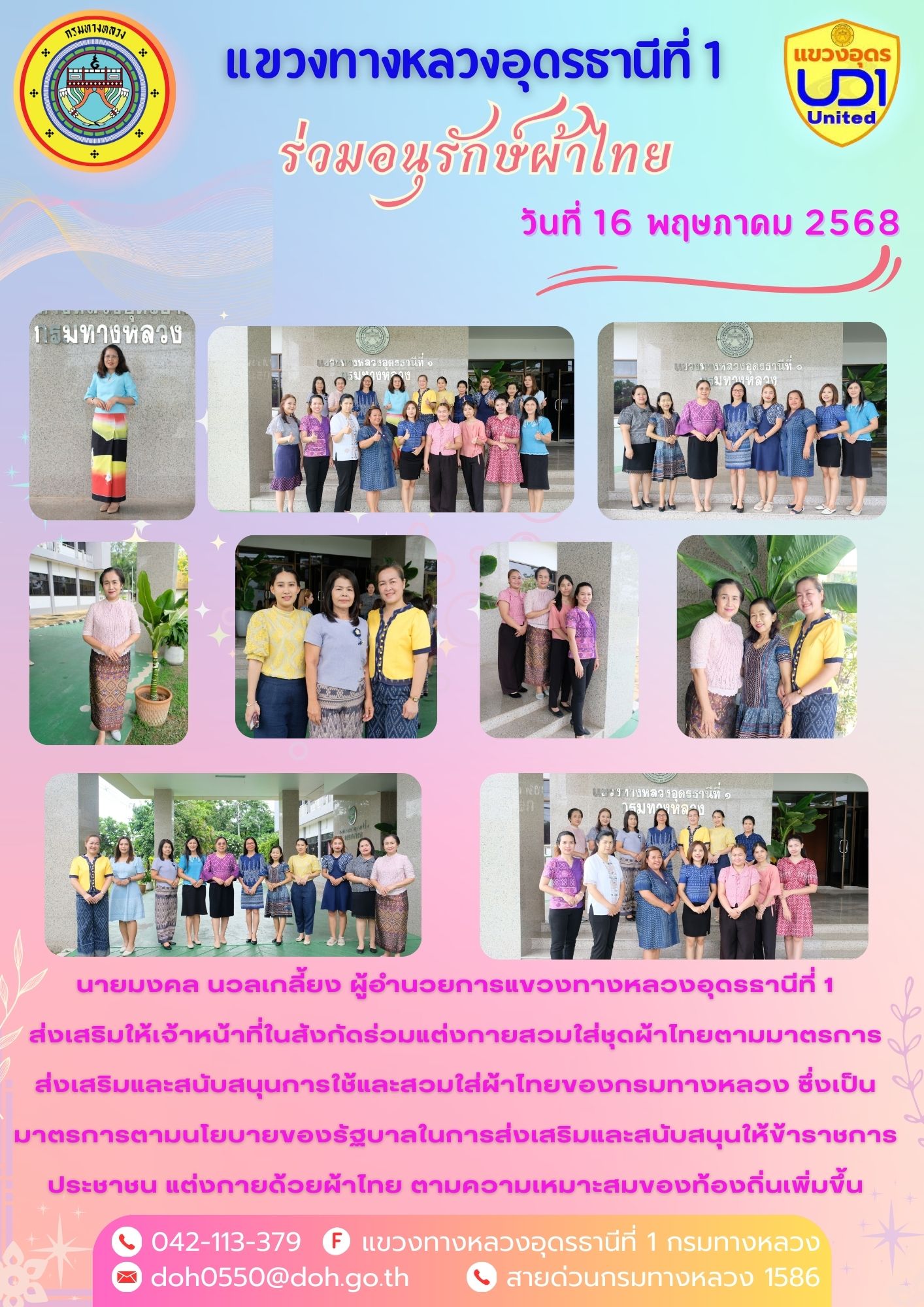 66 16/05/2568 นายมงคล นวลเกลี้ยง ผู้อำนวยการแขวงทางหลวงอุดรธานีที่ 1 ส่งเสริมให้เจ้าหน้าที่ในสังกัดร่วมแต่งกายสวมใส่ชุดผ้าไทยตามมาตรการ ส่งเสริมและสนับสนุนการใช้และสวมใส่ผ้าไทยของกรมทางหลวง ซึ่งเป็นมาตรการตามนโยบายของรัฐบาลในการส่งเสริมและสนับสนุนให้ข้าราชการ ประชาชน แต่งกายด้วยผ้าไทย ตามความเหมาะสมของท้องถิ่นเพิ่มขึ้น