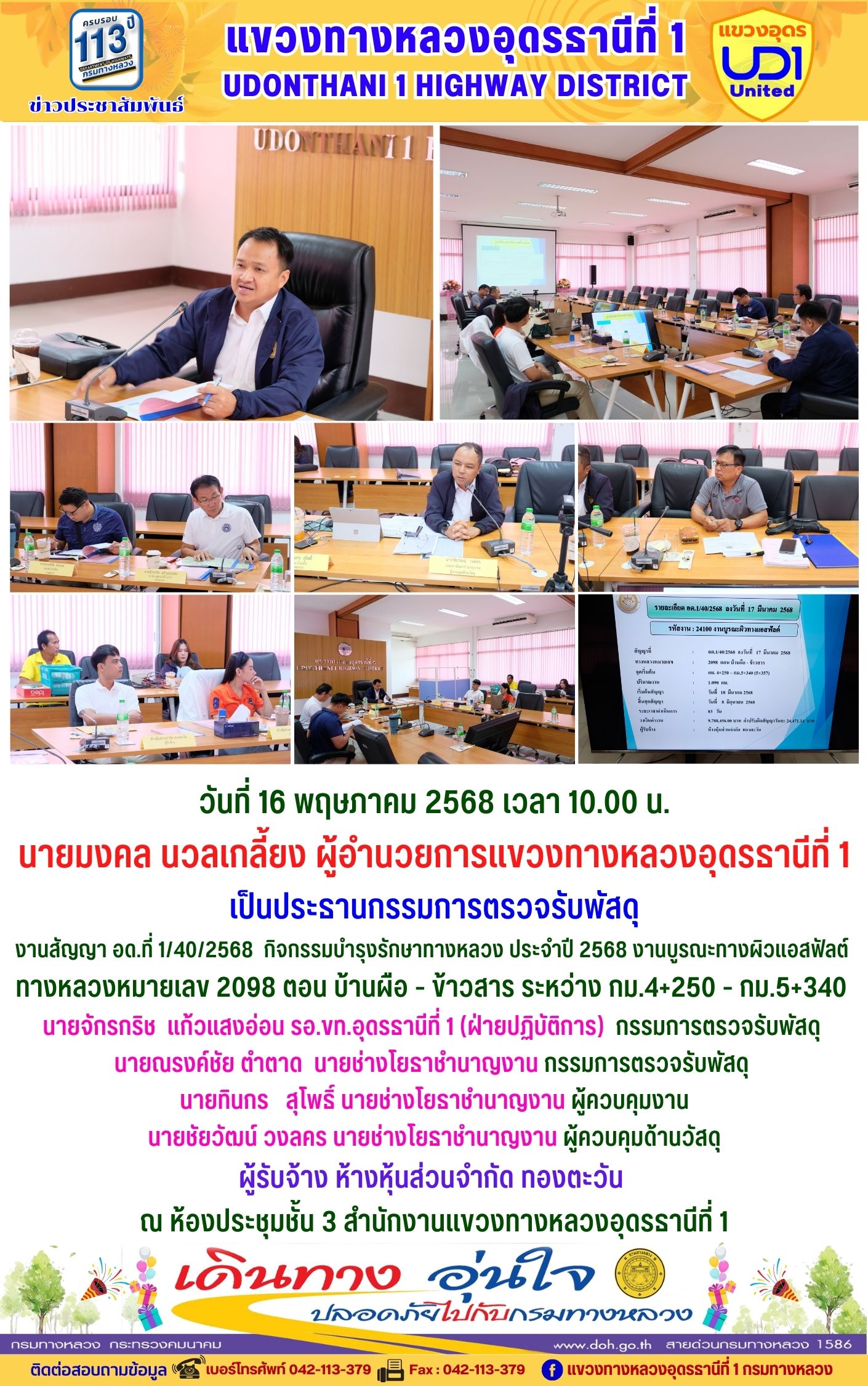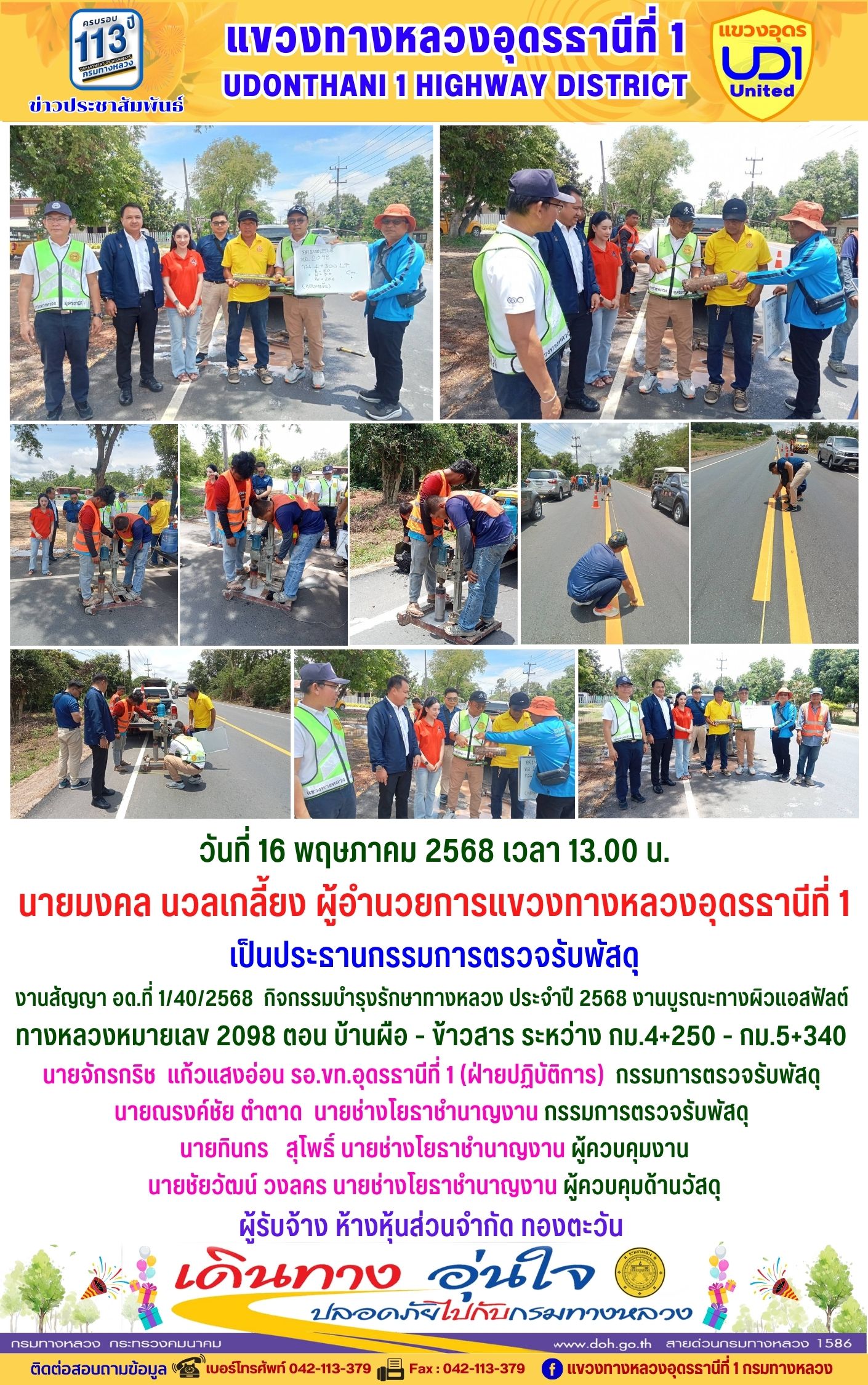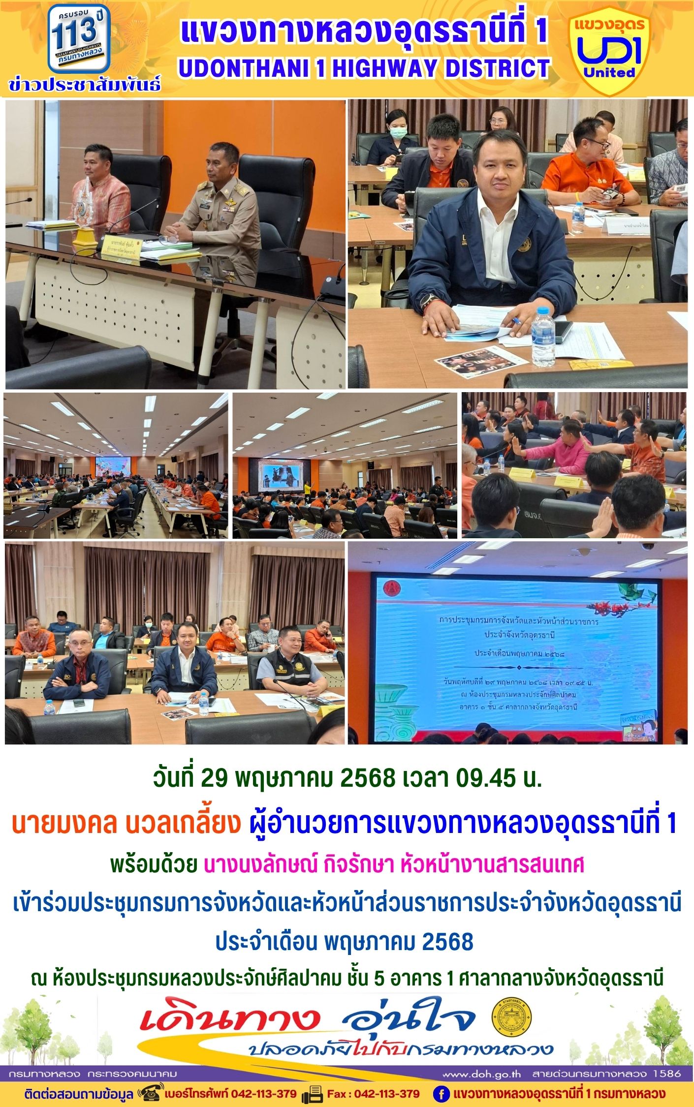 66 16/05/2568 นายมงคล นวลเกลี้ยง ผู้อำนวยการแขวงทางหลวงอุดรธานีที่ 1 ส่งเสริมให้เจ้าหน้าที่ในสังกัดร่วมแต่งกายสวมใส่ชุดผ้าไทยตามมาตรการ ส่งเสริมและสนับสนุนการใช้และสวมใส่ผ้าไทยของกรมทางหลวง ซึ่งเป็นมาตรการตามนโยบายของรัฐบาลในการส่งเสริมและสนับสนุนให้ข้าราชการ ประชาชน แต่งกายด้วยผ้าไทย ตามความเหมาะสมของท้องถิ่นเพิ่มขึ้น