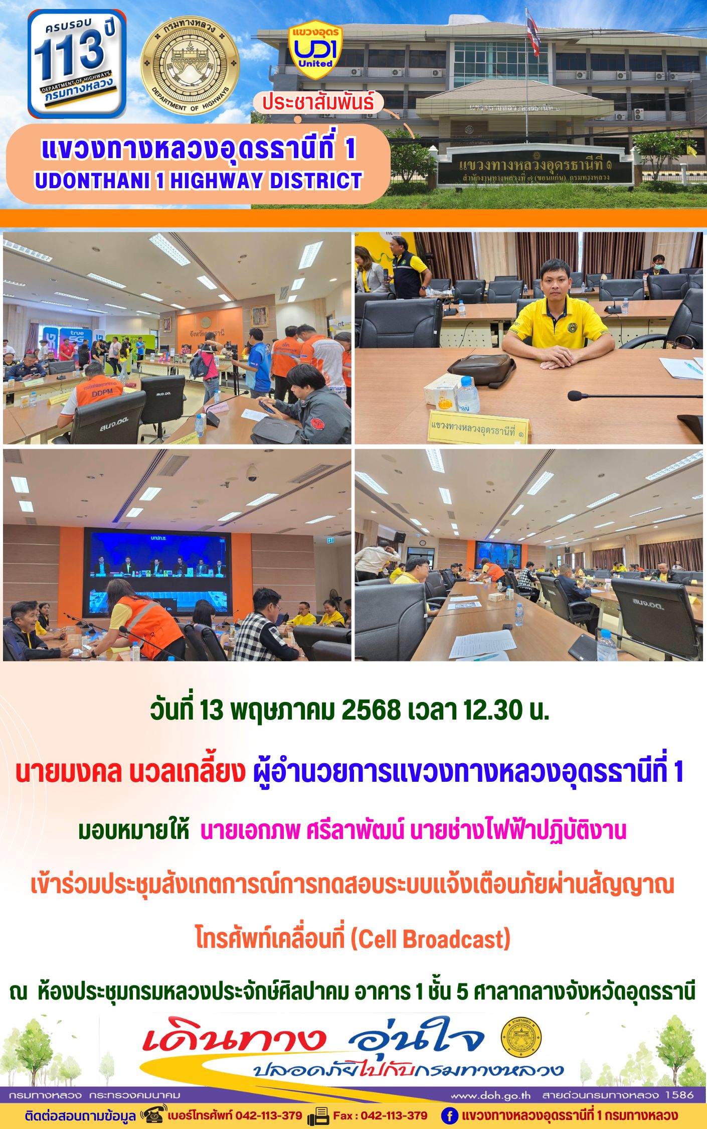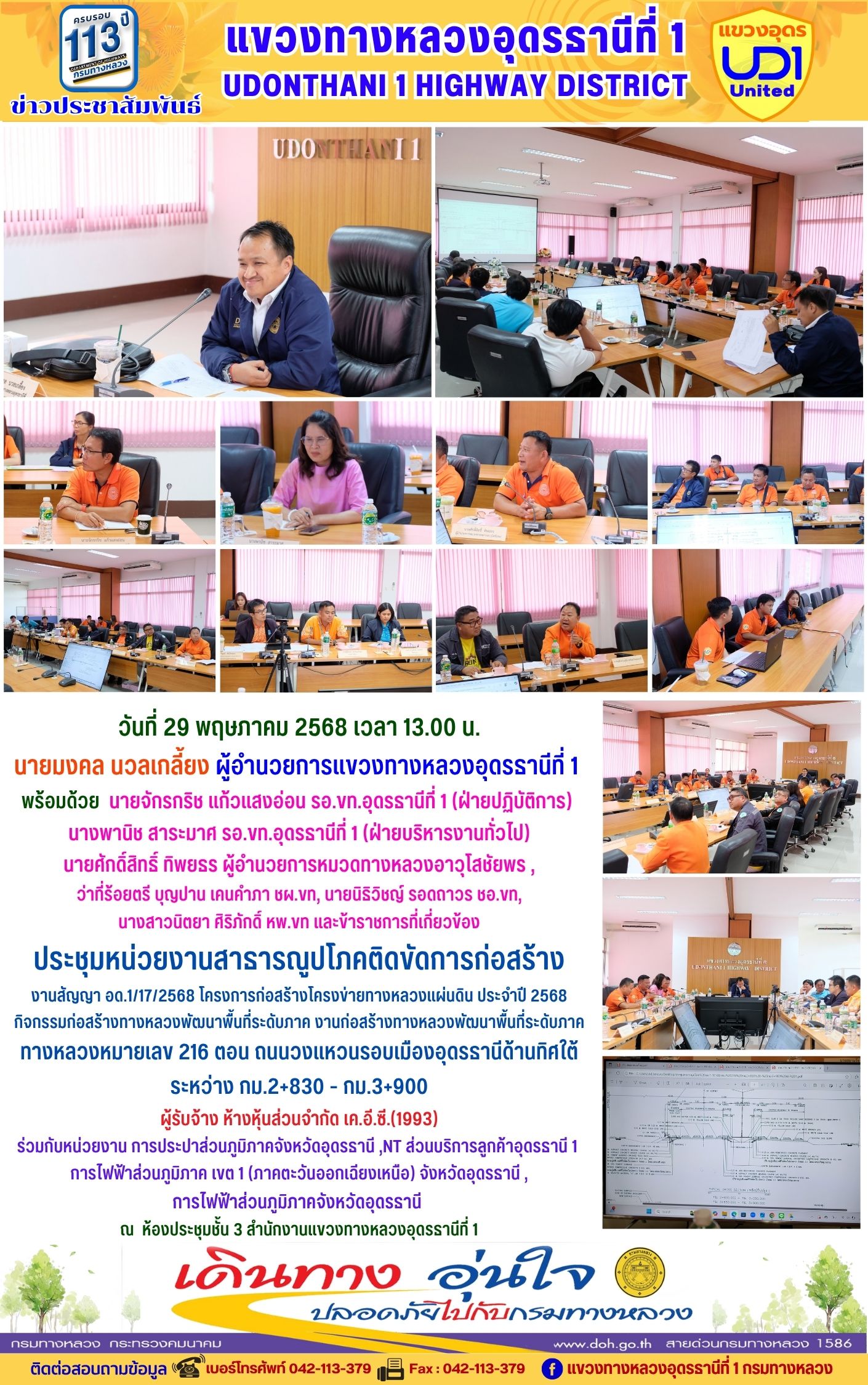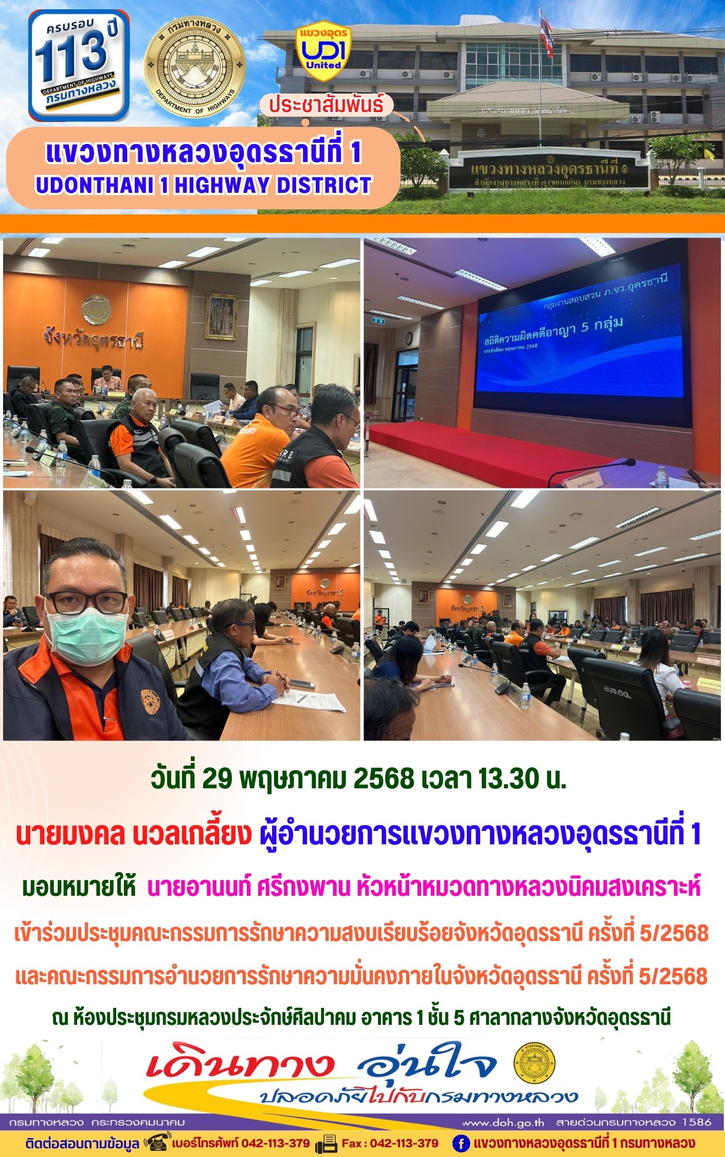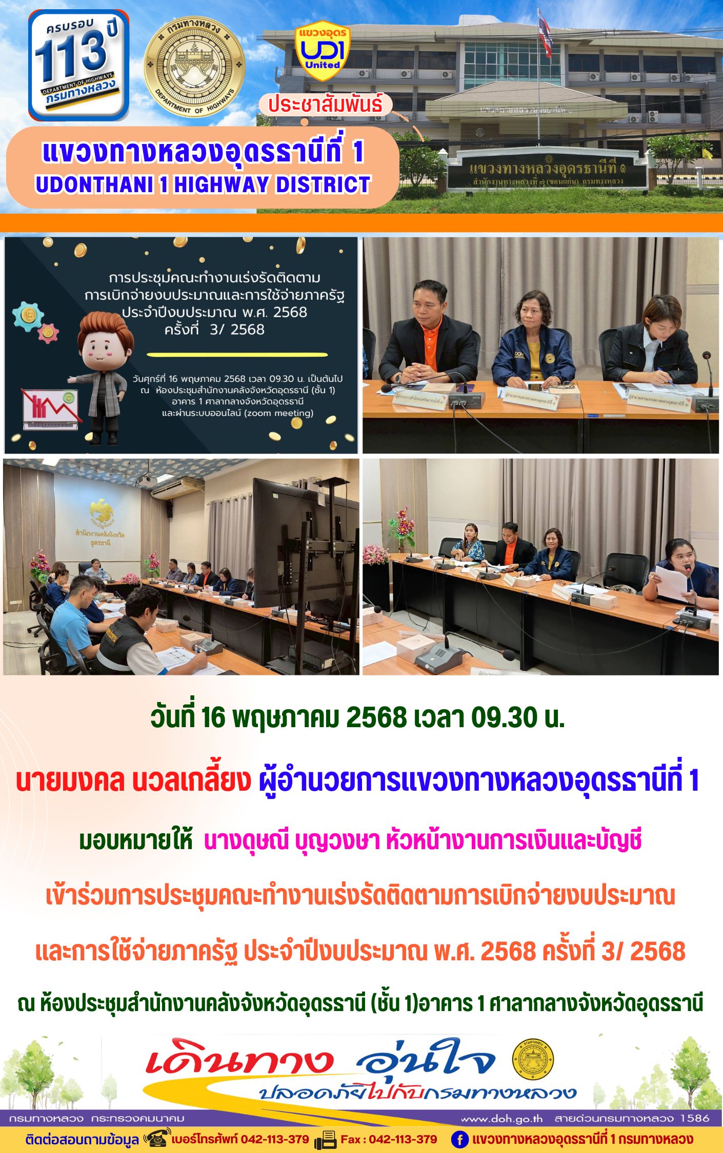 66 16/05/2568 นายมงคล นวลเกลี้ยง ผู้อำนวยการแขวงทางหลวงอุดรธานีที่ 1 ส่งเสริมให้เจ้าหน้าที่ในสังกัดร่วมแต่งกายสวมใส่ชุดผ้าไทยตามมาตรการ ส่งเสริมและสนับสนุนการใช้และสวมใส่ผ้าไทยของกรมทางหลวง ซึ่งเป็นมาตรการตามนโยบายของรัฐบาลในการส่งเสริมและสนับสนุนให้ข้าราชการ ประชาชน แต่งกายด้วยผ้าไทย ตามความเหมาะสมของท้องถิ่นเพิ่มขึ้น